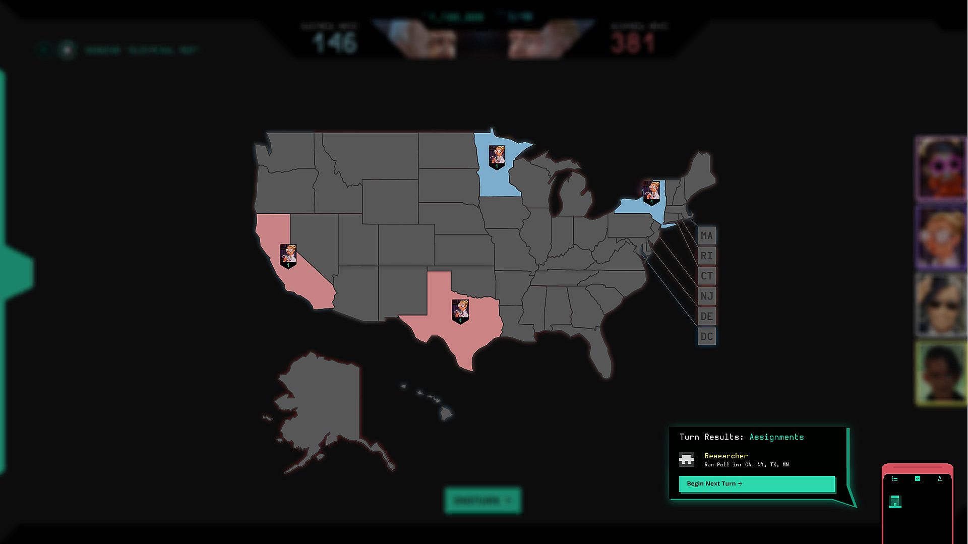 • Procedurally generated voters. Up to 51,000. We have 15 distinct base voter profiles, from which we generate thousands of variants when you start a new game!