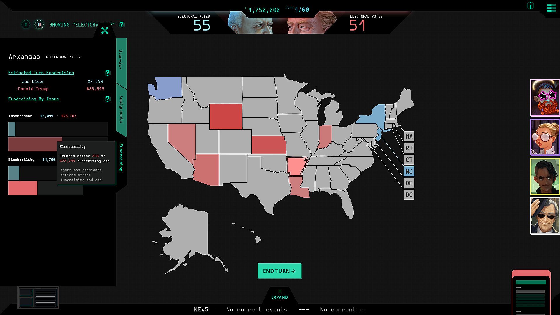 As the Electioneer, your focus is on changing voter opinion to win votes for the candidate you support. 2020 has been a busy year. Events such as Trump's Impeachment or the COVID-19 outbreak create new issues for the voters to consider. As things unfold, you research topics within each new issue, such as Trump's acquittal and the first Covid-19 case in America, and make strategic ad buys to sway voters. While you're off spinning the issues, the candidates don't even know you exist. Their goal is to crush each other, just like the actual election. They apply strategies designed to win over voters using any method they can to win.