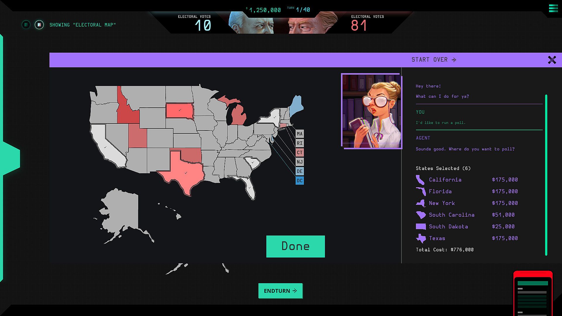 Your job is to learn what voters think by taking out polls, hacking the candidates, and stealing information from their campaign! Making sure your candidate comes out on top is not going to be easy. The landscape is changing; electioneering mimics this new environment, asking users to choose between hundreds of different Events, Issues, Topics, and Arguments (spin) to reshape the conversation and even the country.