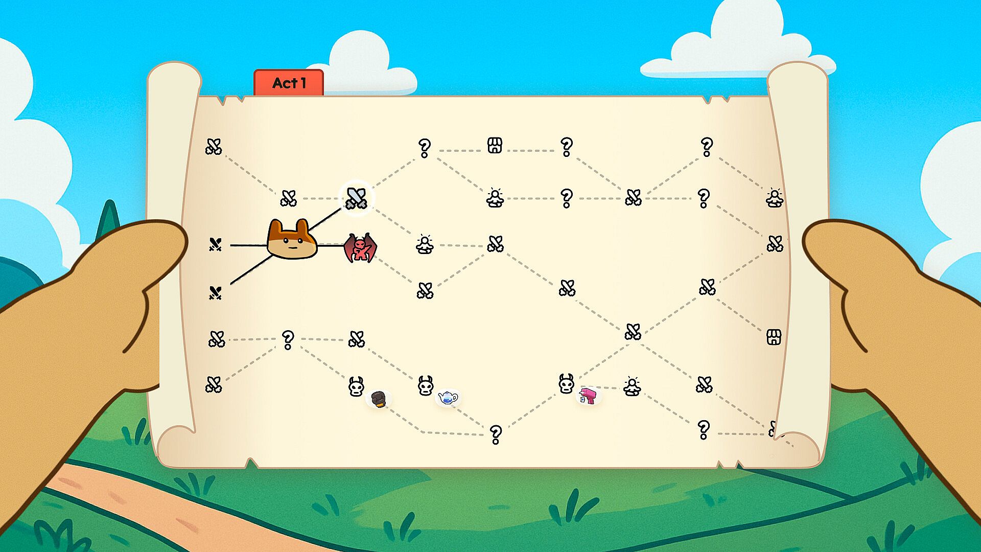 Explore hidden corners of the map to discover relics that enhance your deck.