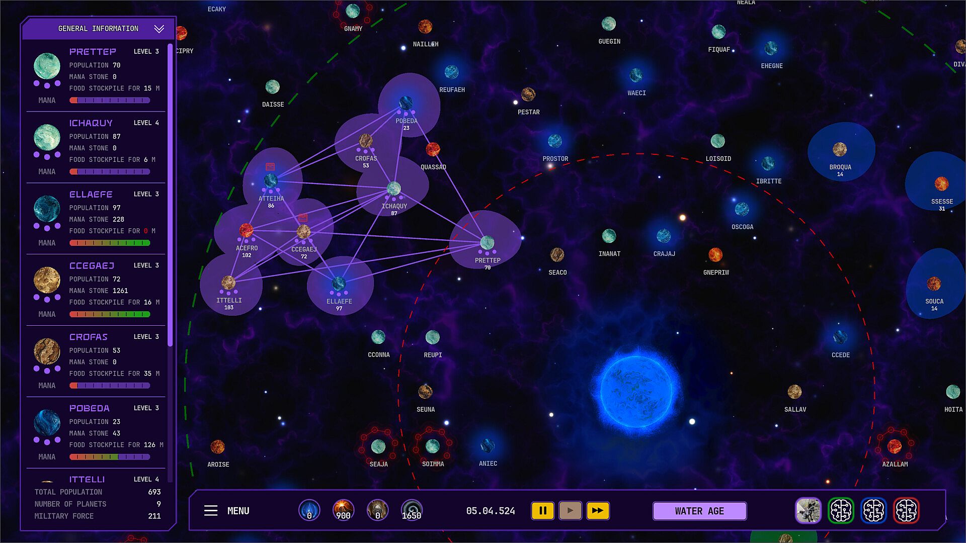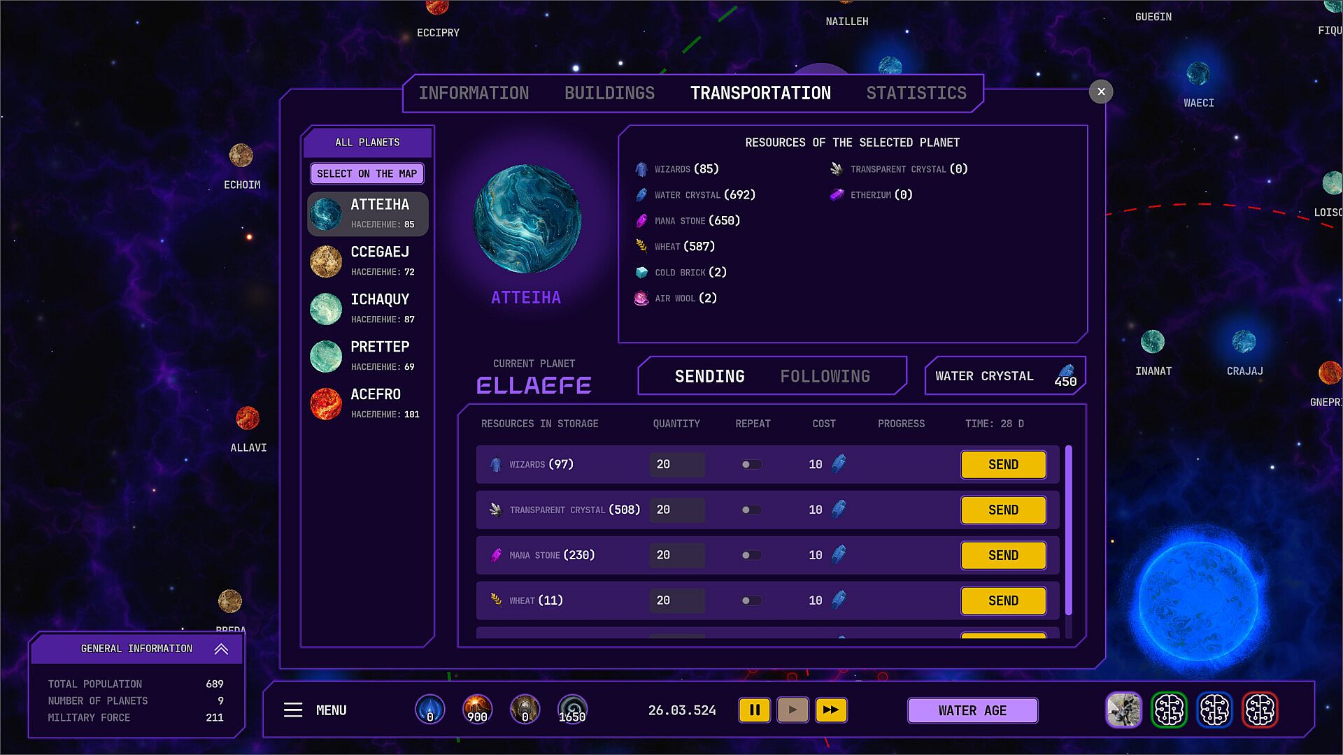 Take on the role of managing a group of wizards who have arrived in a new world. Start by managing one planet. Build buildings, assign people to industries. Build more buildings. Capture nearby planets and expand your influence.