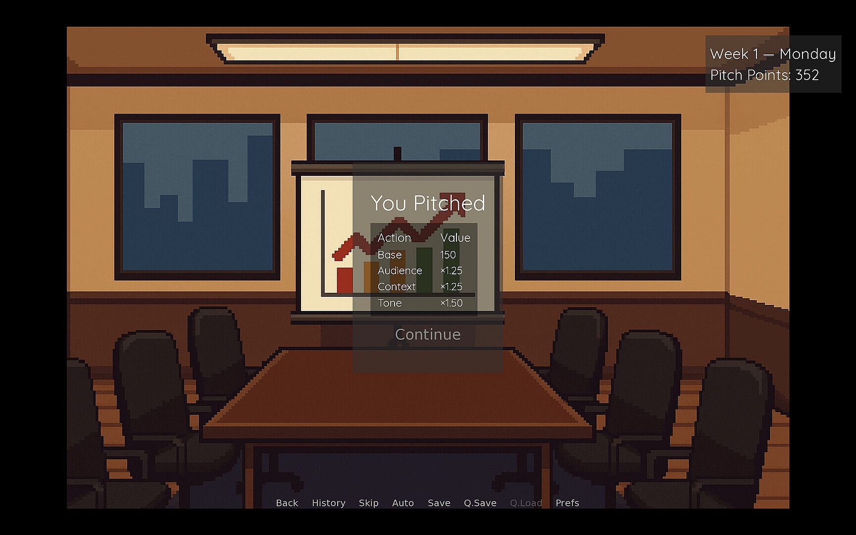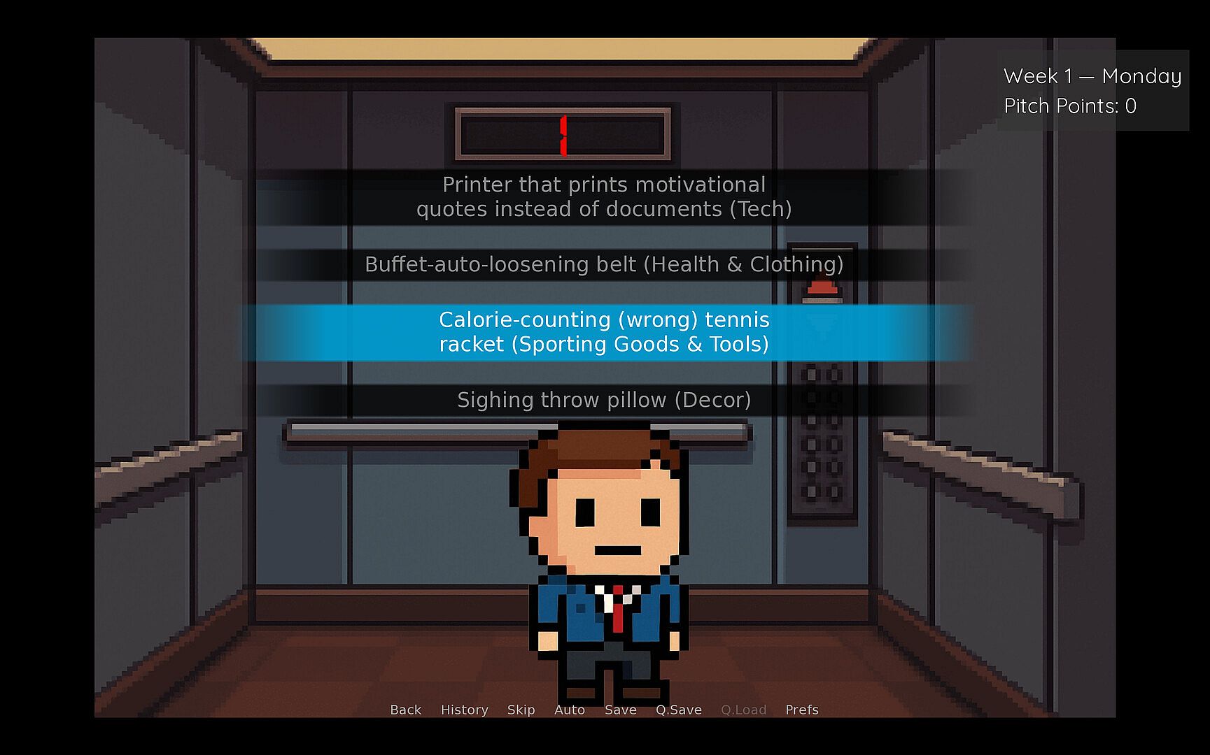 As you rise through the building, you'll face increasingly intense (and unreasonably muscular) executives, rival coworkers, and strange office politics. Navigate branching dialogue, make choices that shape your fate, and develop your character’s professional edge with each pitch. The loop is simple: ride, pitch, adapt—but every floor introduces new surprises.