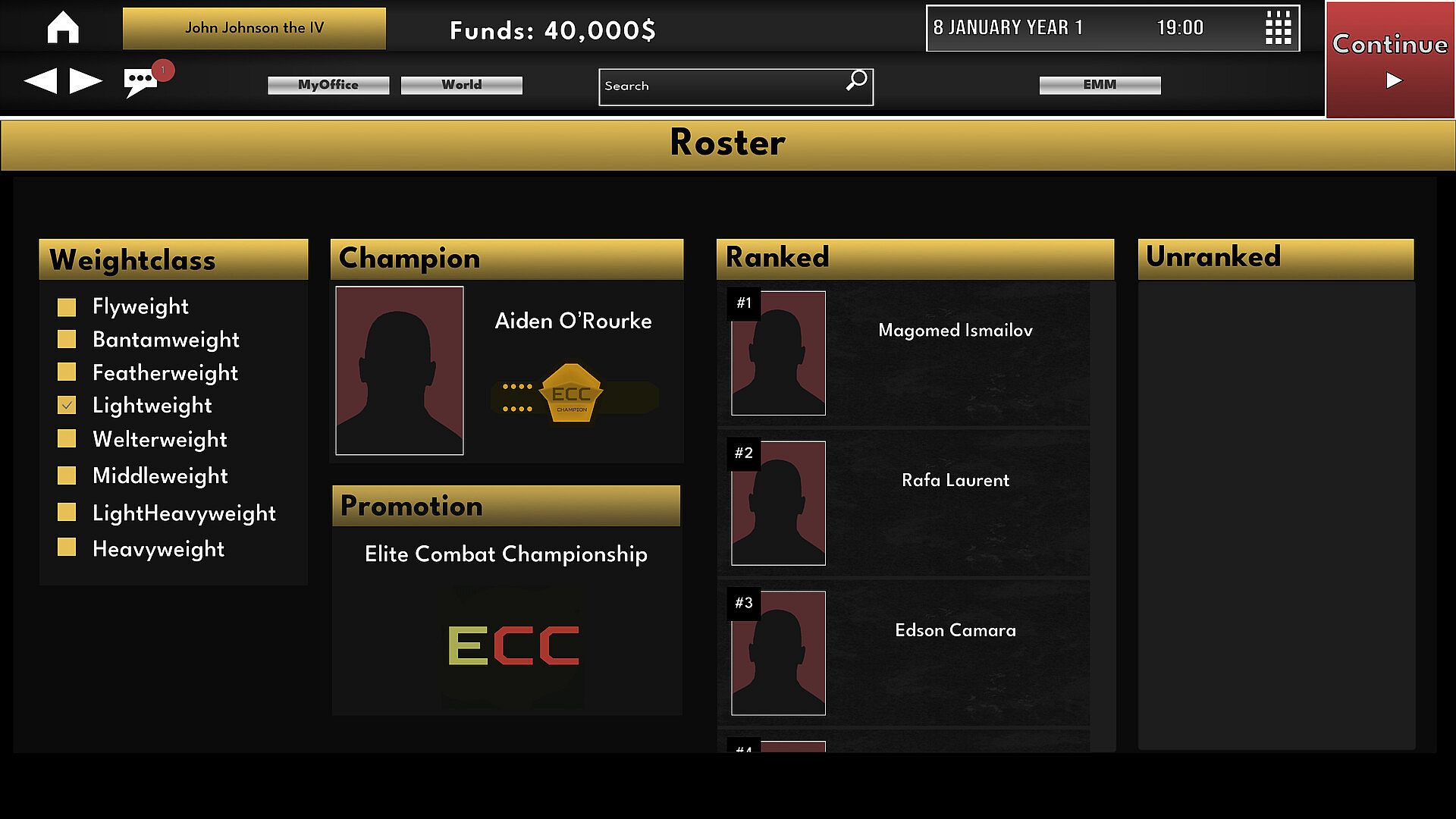 Manage fighters across multiple promotions and weight classes.