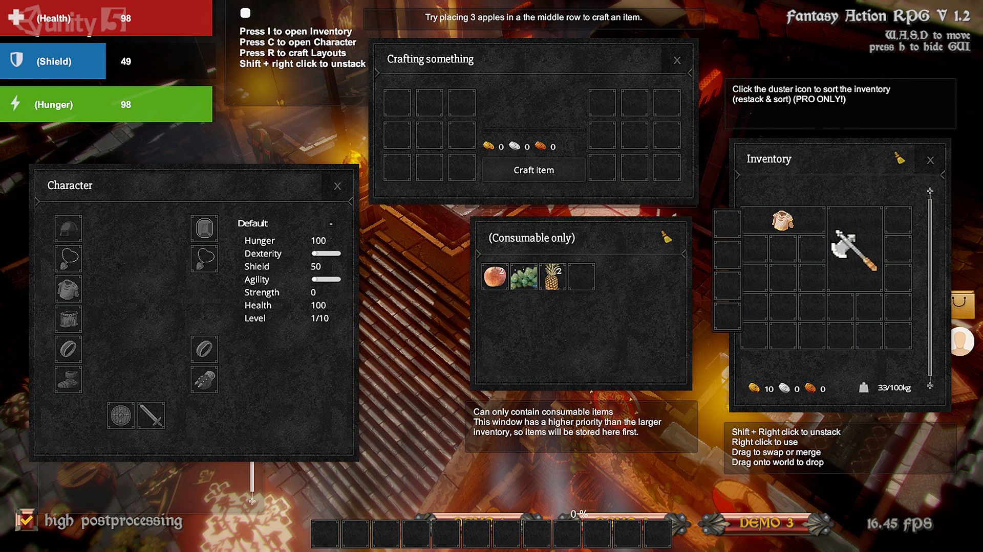 This has an advanced inventory and it saves progress this is the completed inventory. The 2nd partial inventory will be adapted over time as the code needs to be coded for each individual object and this takes time. Some are coded in this edition and some are not yet implemented. Inventory & Quests keys: J,K,I. Horse Mount Keys: F.