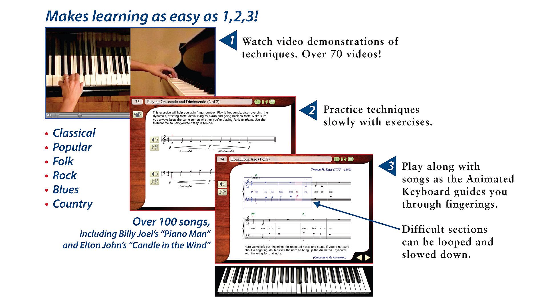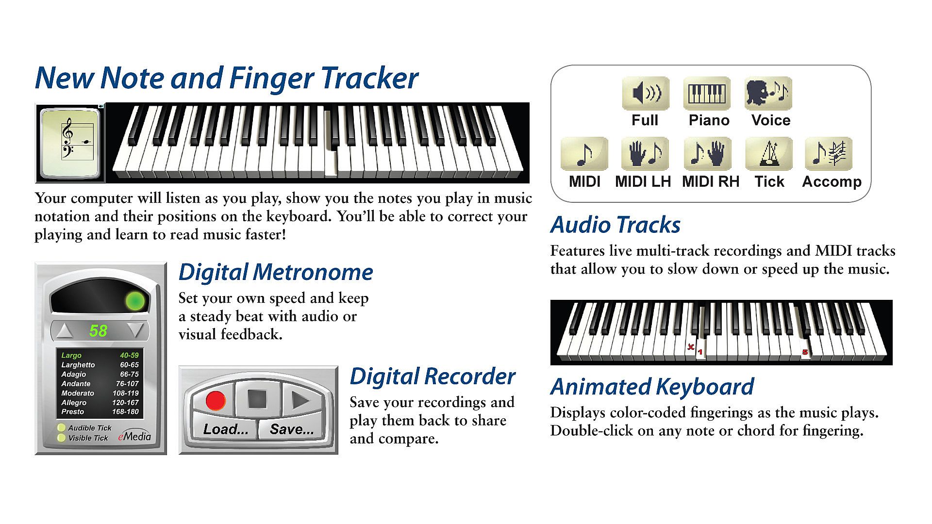 • eMedia’s Animated Keyboard that lets you see fingerings for all of the piano lessons, including piano chords, piano scales and songs.