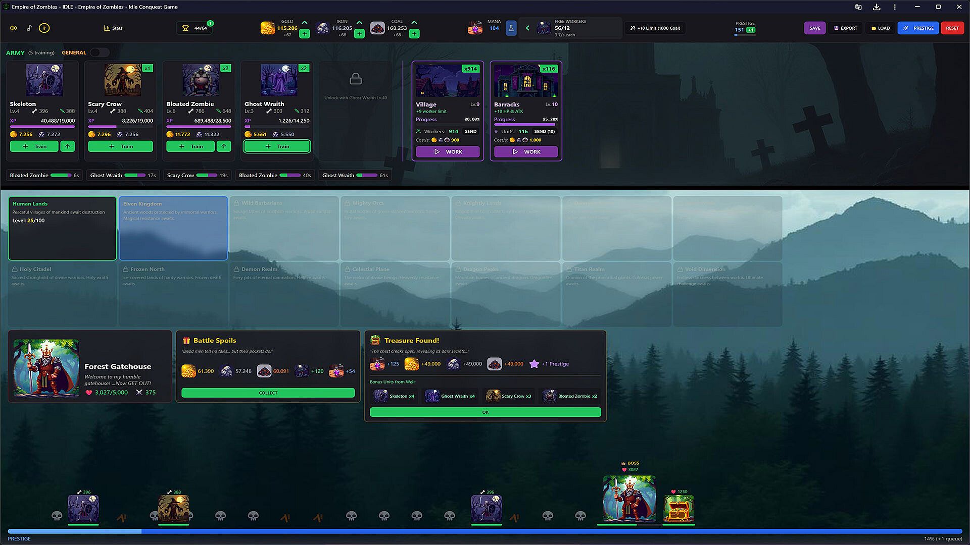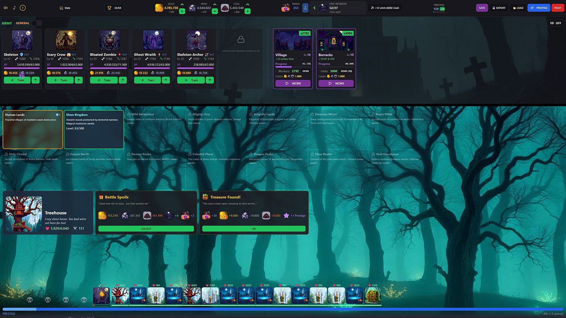 Start small—with a handful of corpses tripping over their own feet—and grow them into an unstoppable corporate machine of darkness. Harvest gold, iron, and coal (because even the undead need resources; you can’t live on brains alone!). Train skeleton warriors, zombie hounds, and banshees, eventually leveling up to the heavy hitters to unleash true legends of the dark.