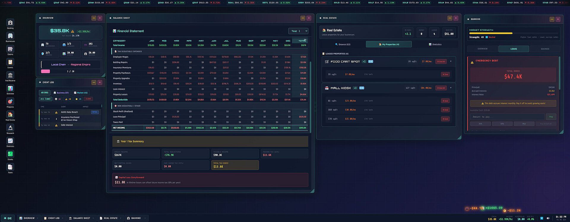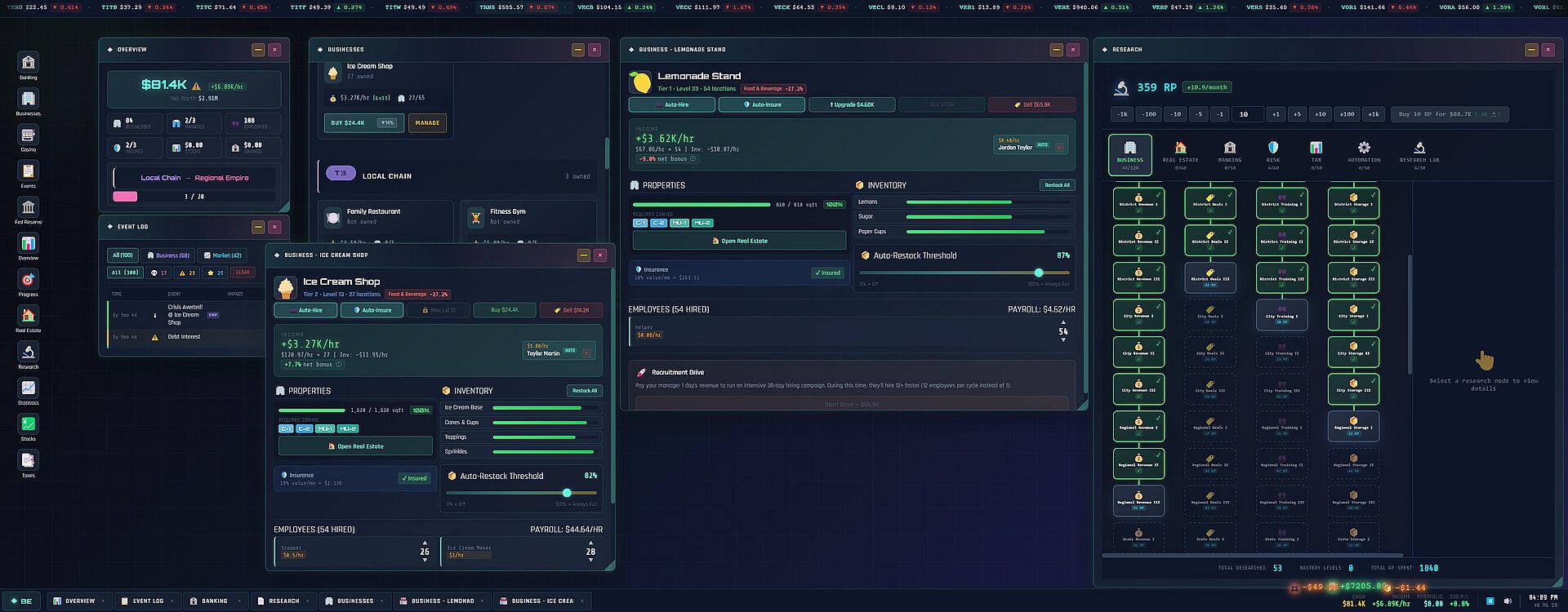 Your businesses need employees, inventory, and space to operate. Hire workers to boost efficiency, but watch the payroll. Stock inventory before it runs out, or watch your income dry up. Rent commercial properties or face space penalties that eat into your margins. Random events will test your resilience: fires, theft, lawsuits, product recalls, and employee drama all chip away at poorly-managed empires. Insurance exists for a reason.