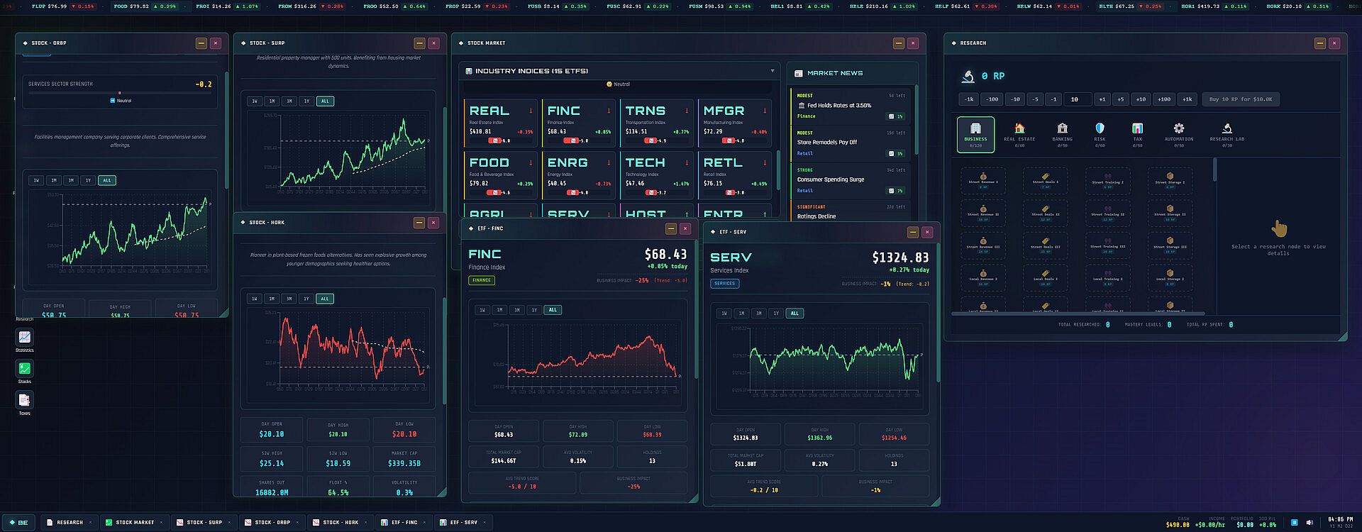 At Tier 2, the stock market opens. Two hundred companies across fifteen industries, each with procedurally generated names, tickers, and price histories. Stocks follow realistic patterns: moving averages, trend reversals, volatility tied to market cap. Industry ETFs let you bet on entire sectors, and holding shares in industries where you own businesses boosts your income.