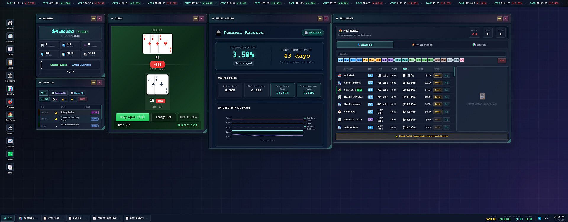A simulated Federal Reserve holds bi-monthly FOMC meetings, adjusting interest rates based on economic indicators. Rate hikes hammer real estate and finance stocks. Cuts boost growth sectors. Your loan rates and savings yields fluctuate accordingly.