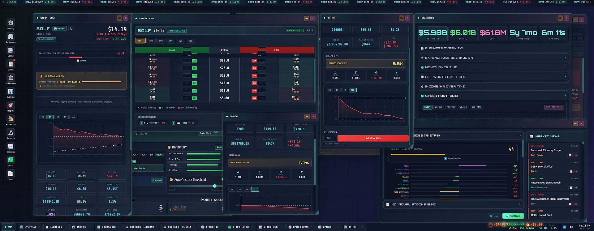 At Tier 4, options trading unlocks. Call and put contracts with Black-Scholes pricing, Greeks displayed for every position. Delta, gamma, theta, vega, rho, implied volatility. Expiration dates, strike prices, in-the-money indicators. The option chain updates live as stock prices move.