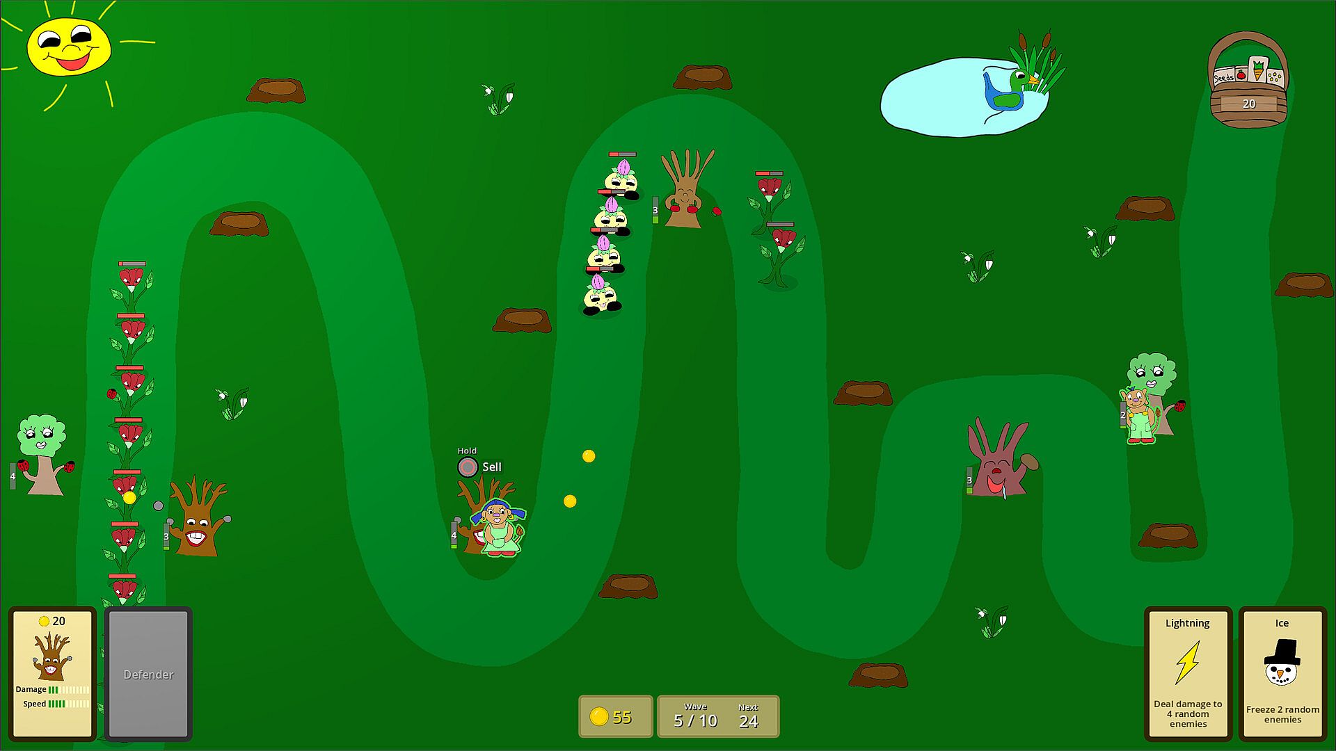 Plant trees to prevent the creatures from reaching the basket. The trees have different strengths, so plant them strategically. Collect coins from defeated creatures to be able to afford more trees.