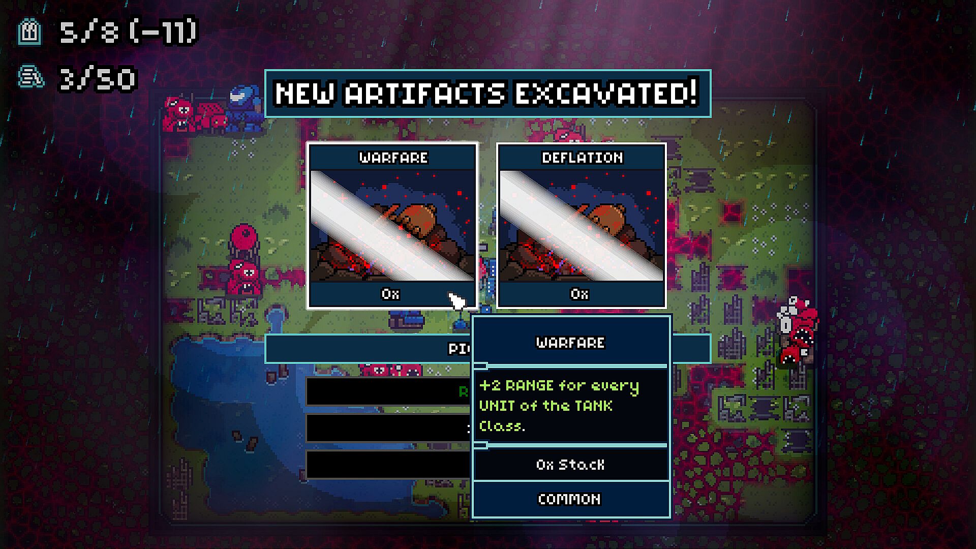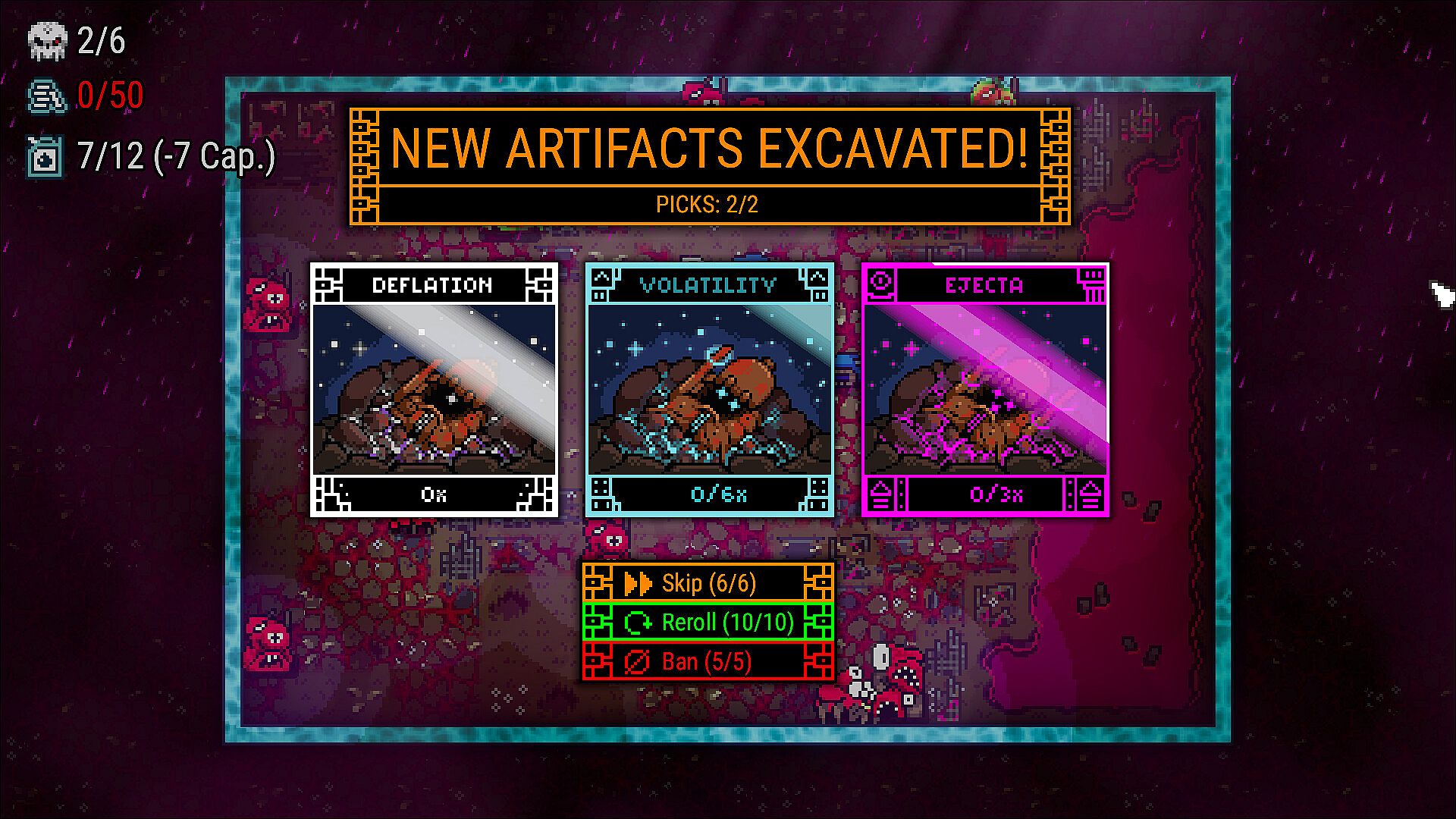 Alien Artifacts are scattered across all of the [NULL] Solar System. Collect and combine them for all kinds of game-changing (and sometimes breaking) builds! Among them, you'll encounter Artifacts like SKEWSTONE - which makes ALL Units move diagonally, like checkers; and Armageddon - which makes EVERYTHING deal double Damage. And you can just keep stacking them for as long as you survive!