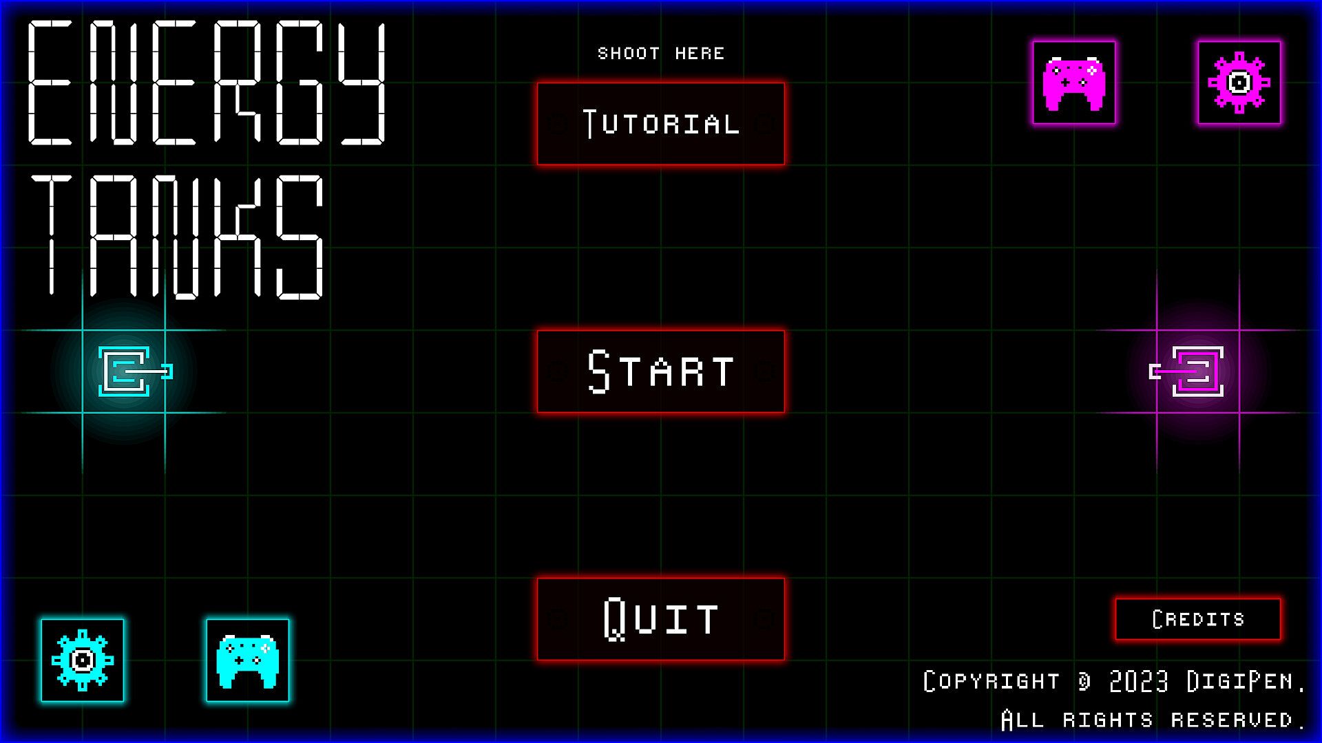 Energy Tanks is a 2 player top-down action tank game that requires the players to think on their toes about what they need to do and where they need to shoot. With fully interactable menus, players will easily understand the base controls of Energy Tanks. After selecting a map to battle each other in, the battle will start! Surrounding the maps are shield generators that help keep players’ shields active. Players will have to take out all the enemy shield generators to be able to destroy the opposing tank. Also on the maps are power ups to aid in achieving victory, each one giving different powers to change your battle plans. Once the final strike has been landed, players are able to restart the battle or choose a different map to play in. However, be careful about where you fire, you never know if your bullets are going to hit your own shield generator, or worse…