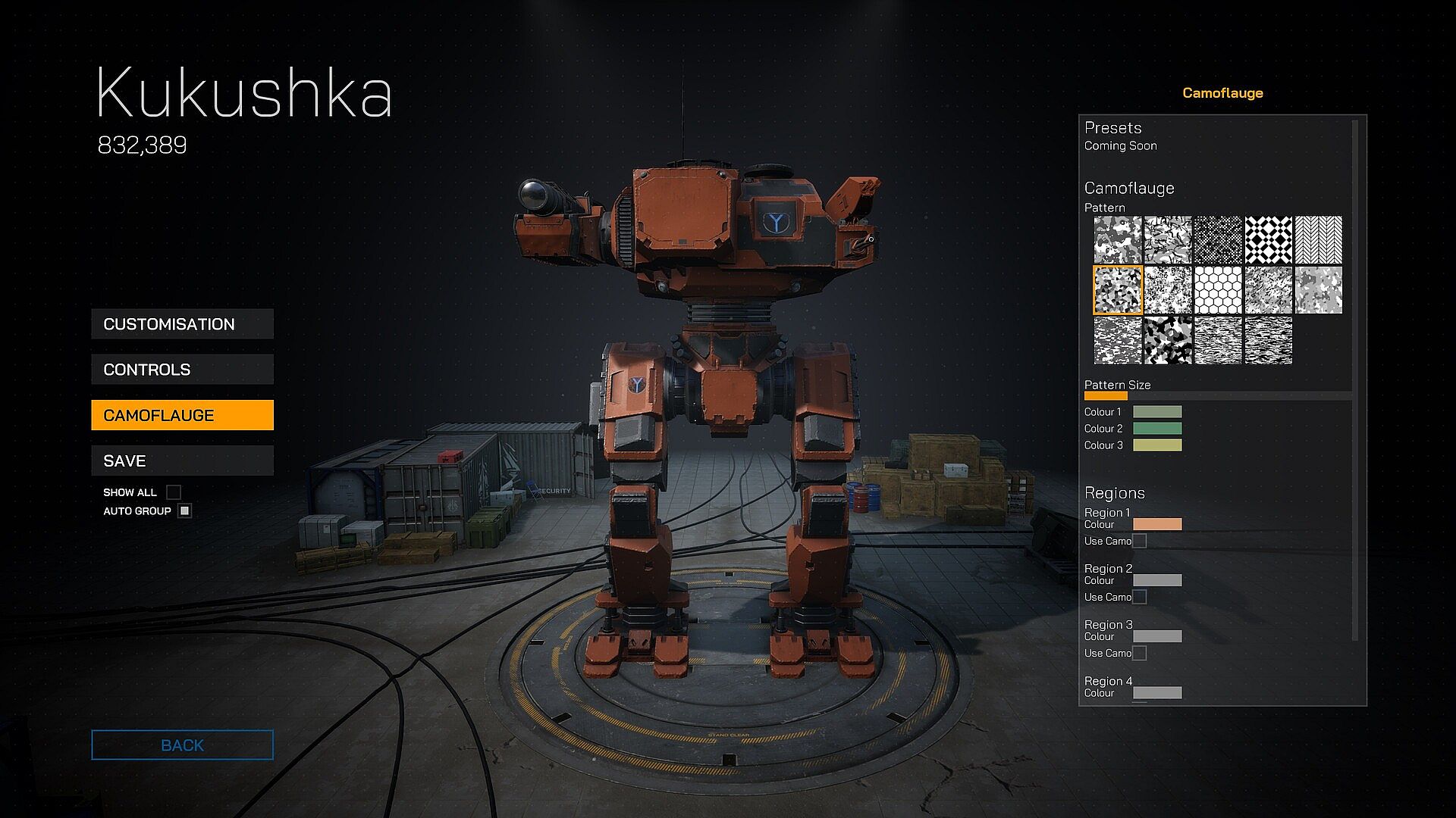 After preparing your setup, dive into the visual customisation. Add decals, edit the camouflage, change colours for each mech region, and more.