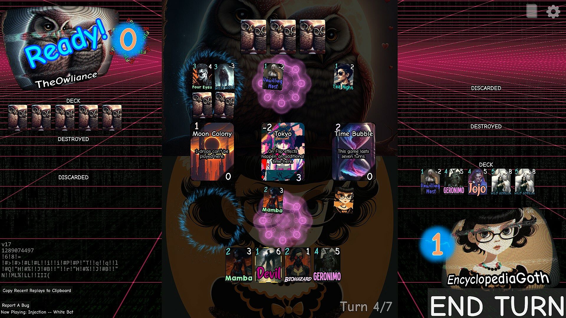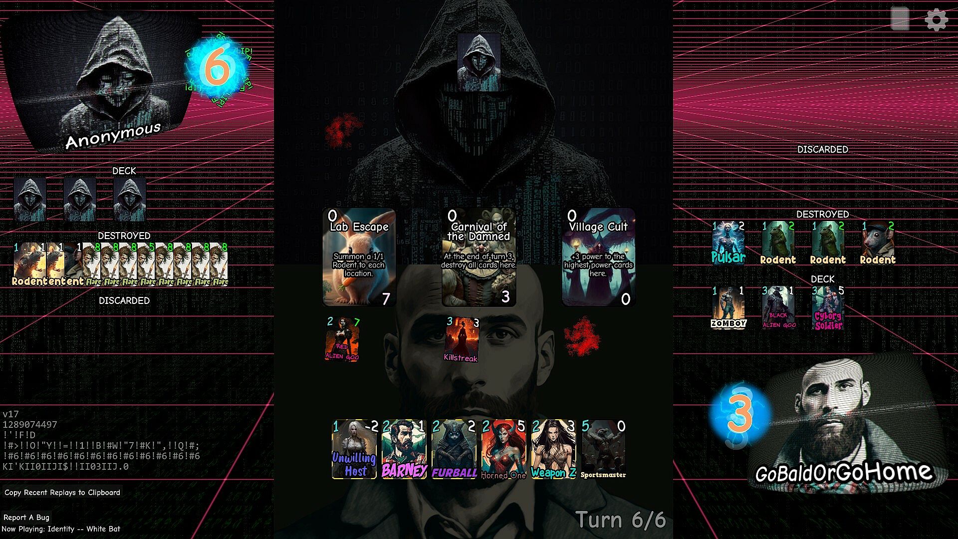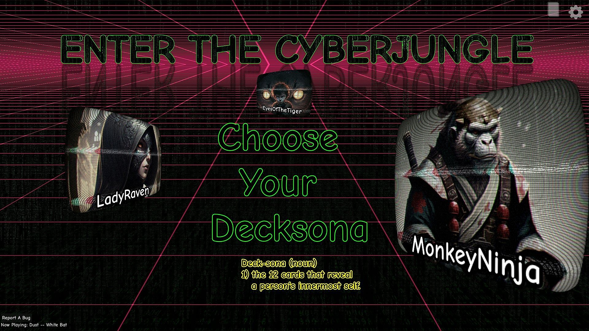 Enter the Cyberjungle is a single-player, deckbuilding card game inspired by the rules of ----. Face a desperate struggle of skill and luck as you attempt to turn your pile of worthless digital cardboard heroes into a team that can defy the card game gods and win the Cyberjungle tournament.
