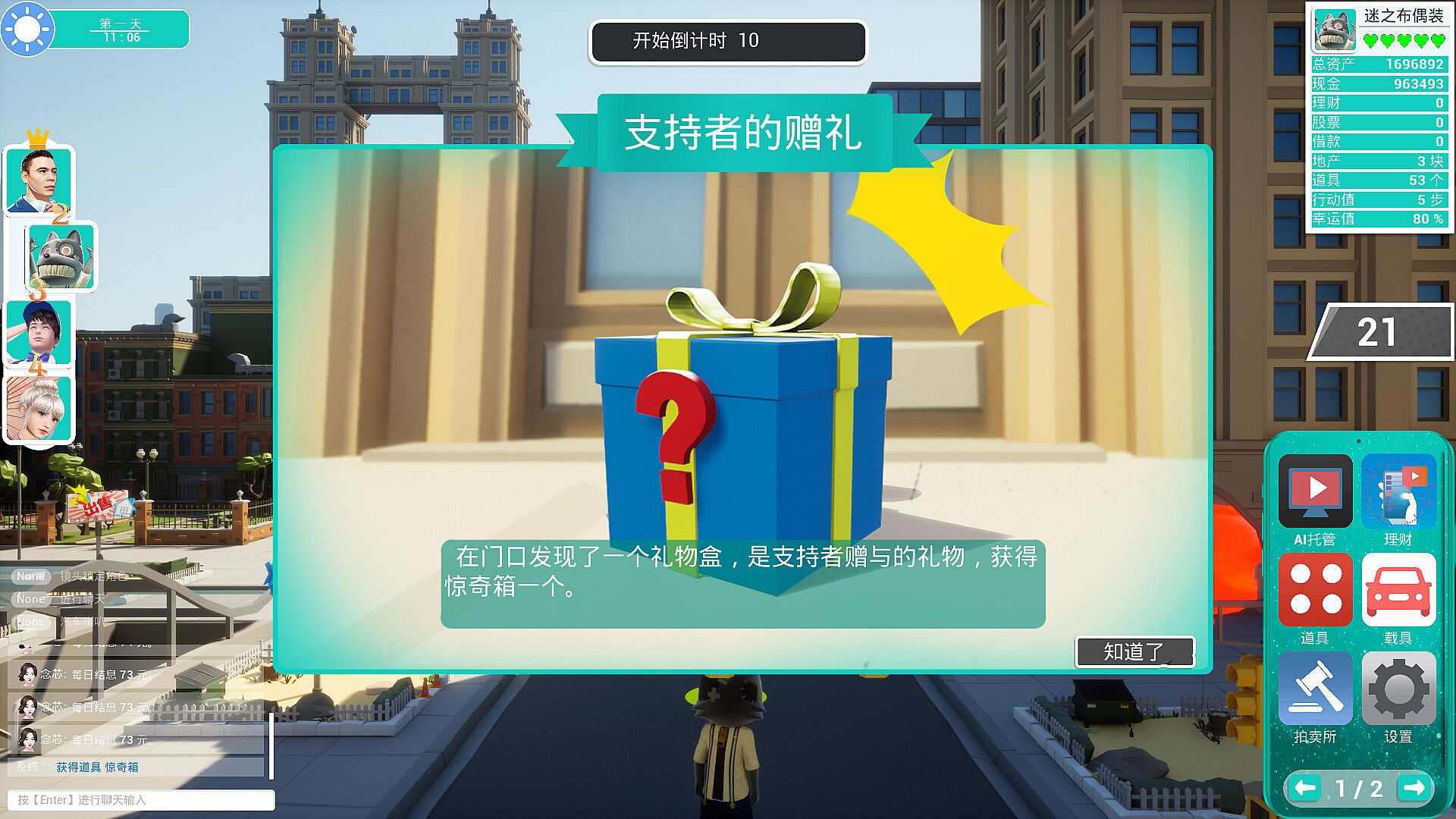 The investable buildings in the game are divided into three categories, including shops focusing on economic income, hotels with detention function and economic income, and research institutes that can obtain free props. Different buildings represent different winning methods, and reasonable arrangement of the land purchased will be the key to the final victory.