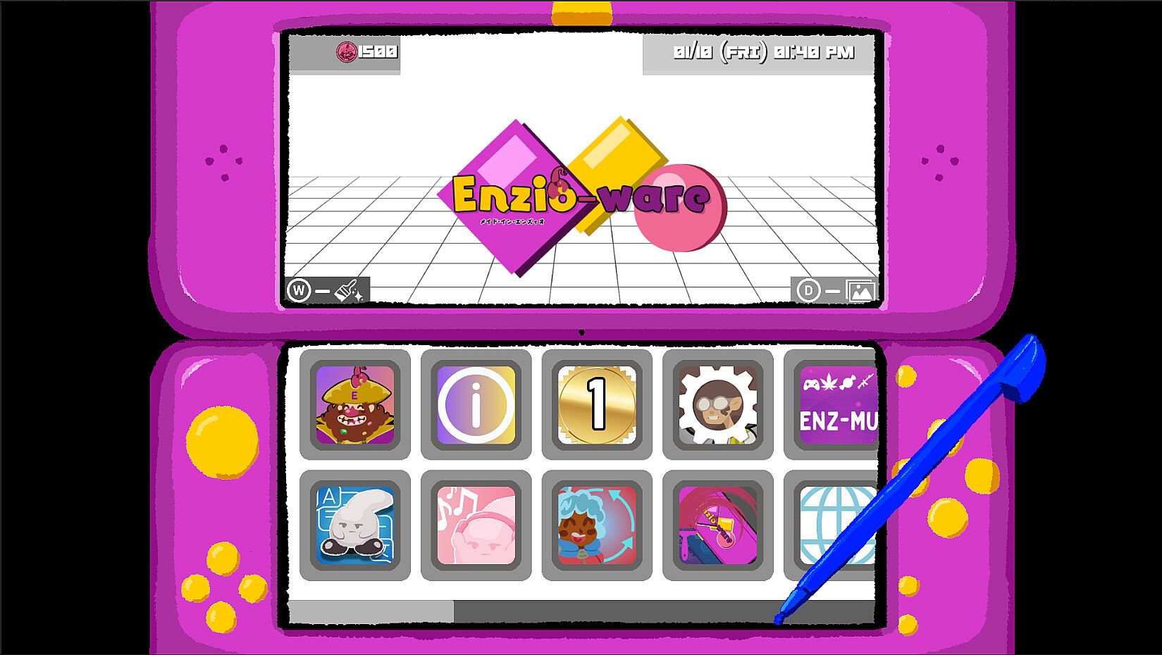 In Enzio-Ware 2.0, your 『Enzio-System』 has been upgraded to the 『Enzio-Systemⓘ』! With the added internet capabilities, you can compete in online leaderboards, and access an online shop to obtain cosmetics such as 『Enzio-System』 skins, stylus, home menu themes, and soundtracks. Enzio-Ware 2.0 has no microtransactions, all cosmetics are earned through a currency earned through normal gameplay