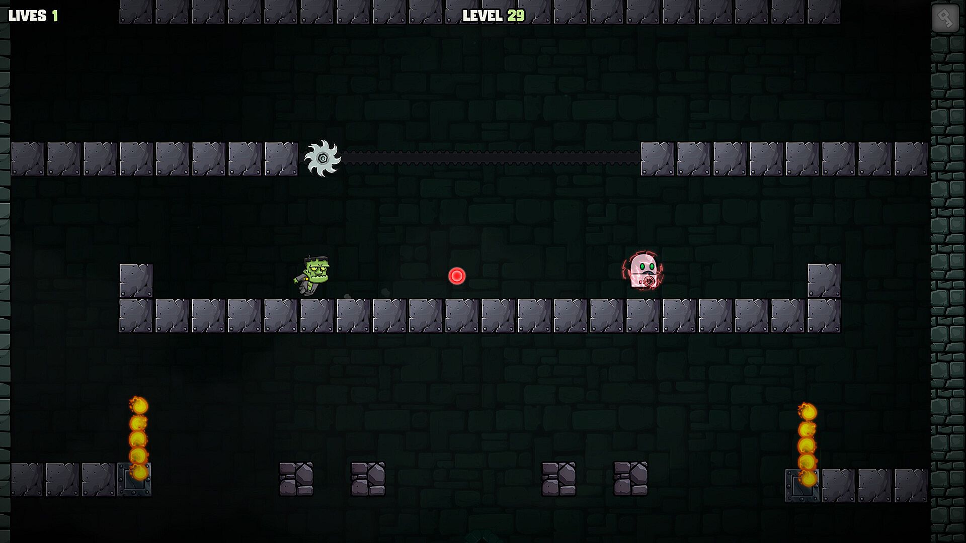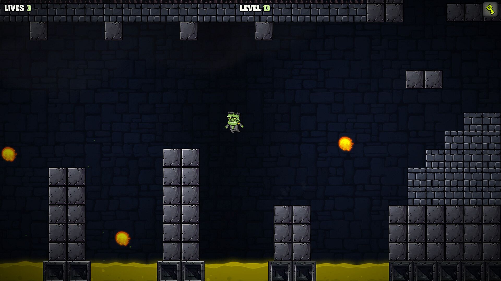 Play as Frankenstein's monster in this indie adventure platformer, racing through the shadowy halls of Dr. Frankenstein's castle to break free. Run and jump across 30 intricate levels packed with traps like spikes, lava, and pitfalls, while battling sinister creatures and solving puzzling mechanisms to grab keys. Uncover secrets tied to your creation and the castle's past as you push toward escape.