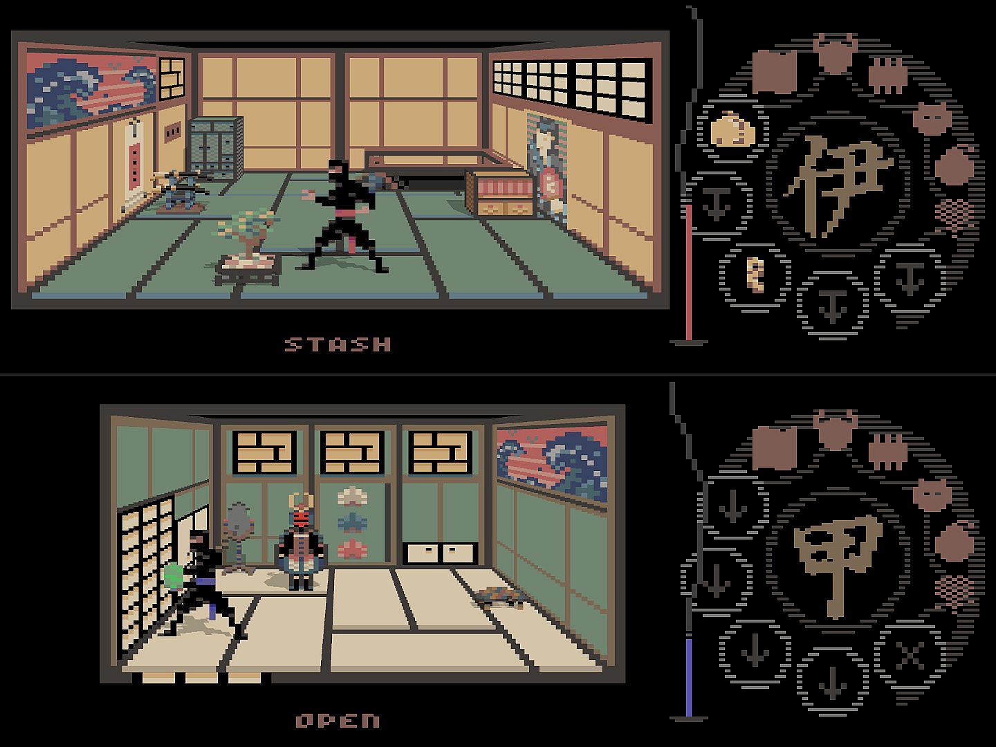 Medieval Japan. An evil daimyo lord has stolen the treasures of Imperial family and hidden them in his castle in an attempt to seize power. As a young Shinobi apprentice, you have decided to sneak into the castle, recover the treasures and return them to their rightful owners to bring prominence to your clan. However, a member of a competing clan has also discovered daimyo's scheme and is on the same mission as you. Do whatever it takes to be the first to recover stolen items and bring honour to your clan.