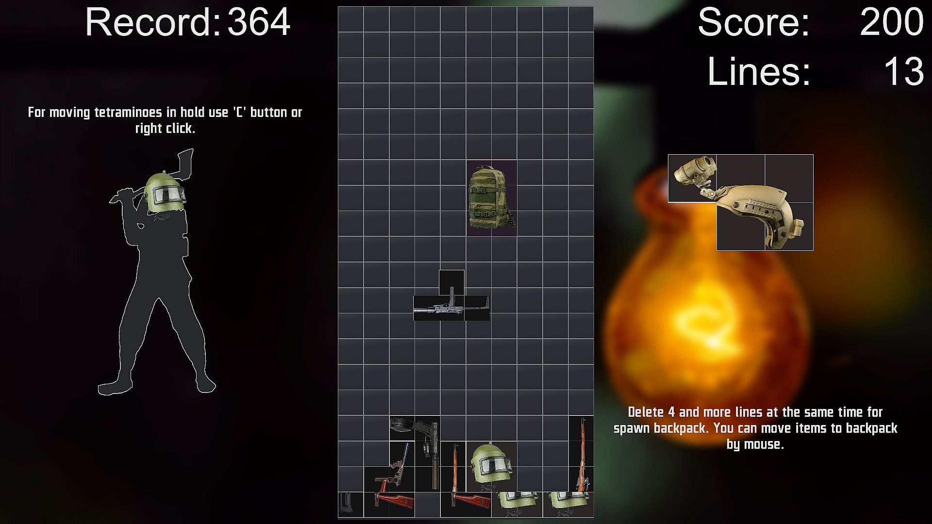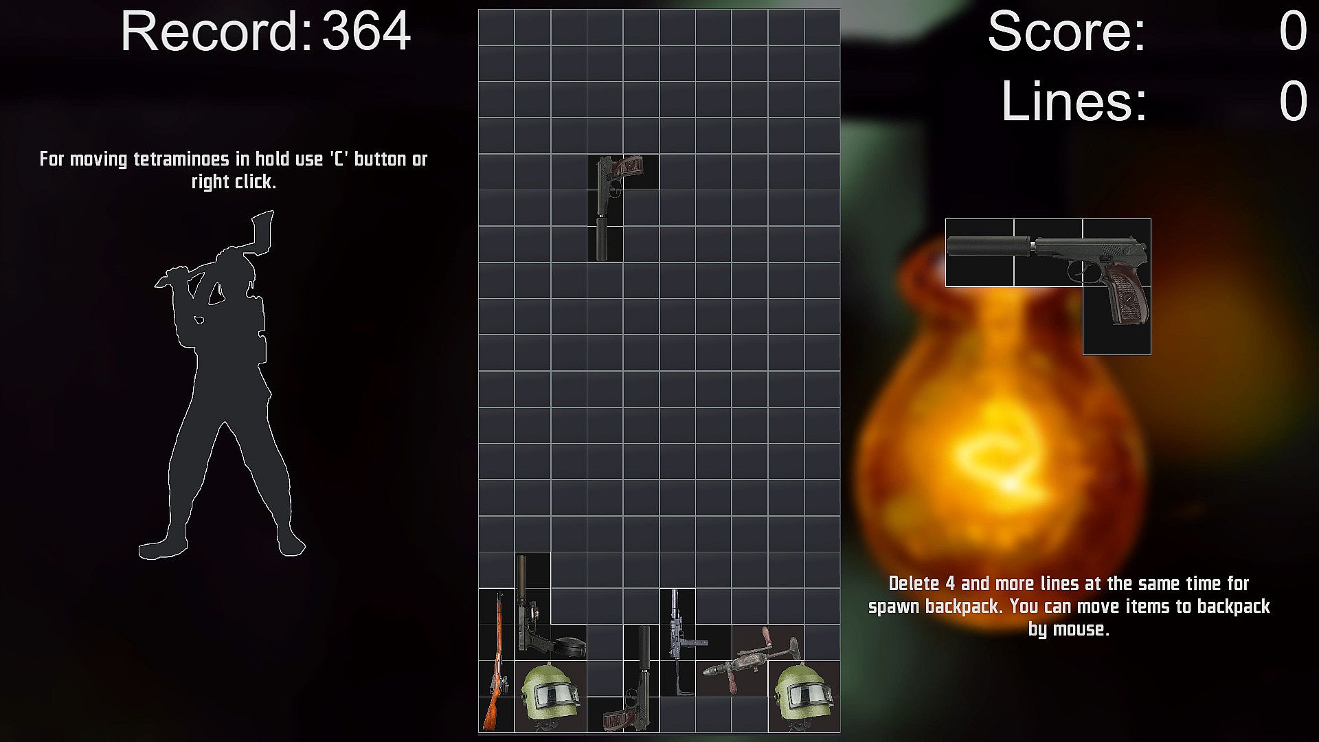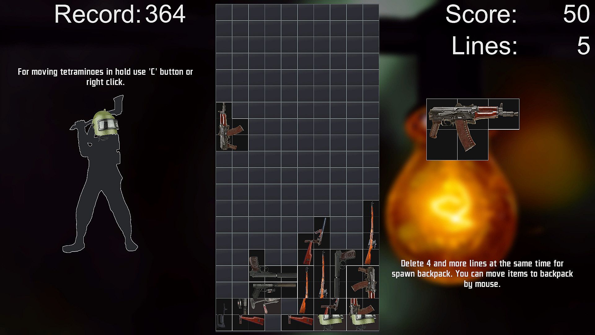 • A classic puzzle game inspired by many shooters. You have to put the loot found by the PMC into your backpack as quickly as possible, until you run out of space.