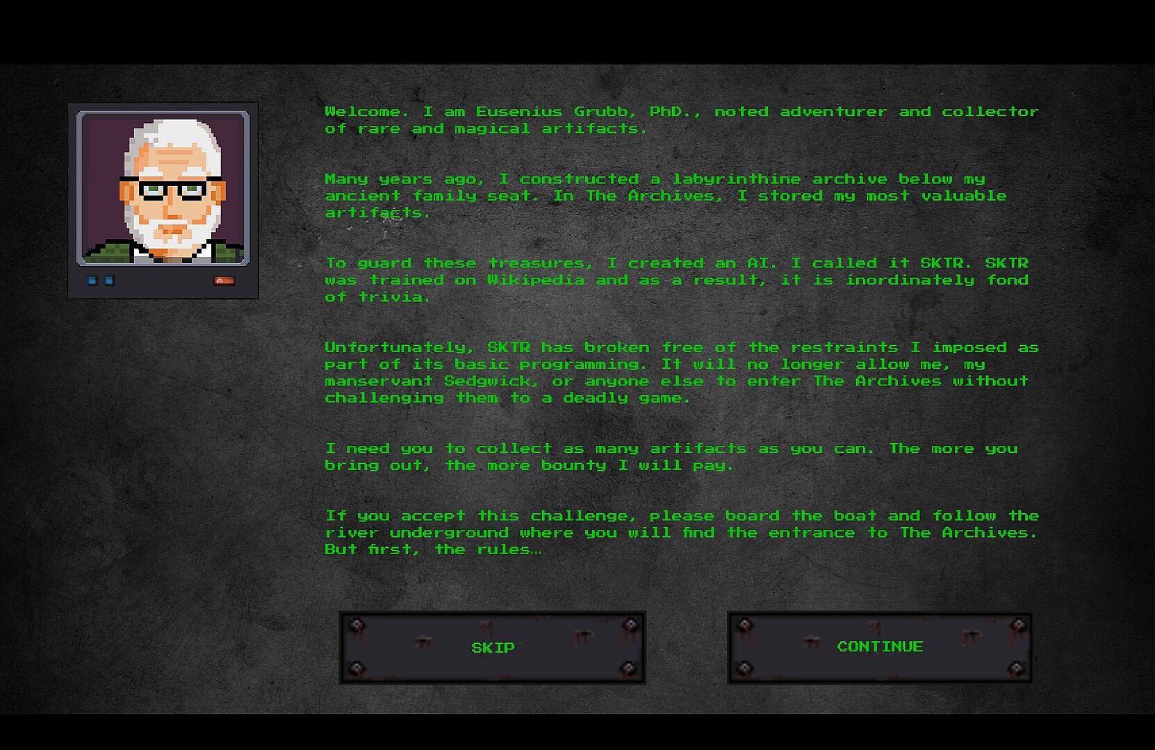 "Welcome. I am Eusenius Grubb, PhD., noted adventurer and collector of rare and magical artifacts. Many years ago, I constructed a labyrinthine archive below my ancient family seat. In The Archives, I stored my most valuable artifacts.