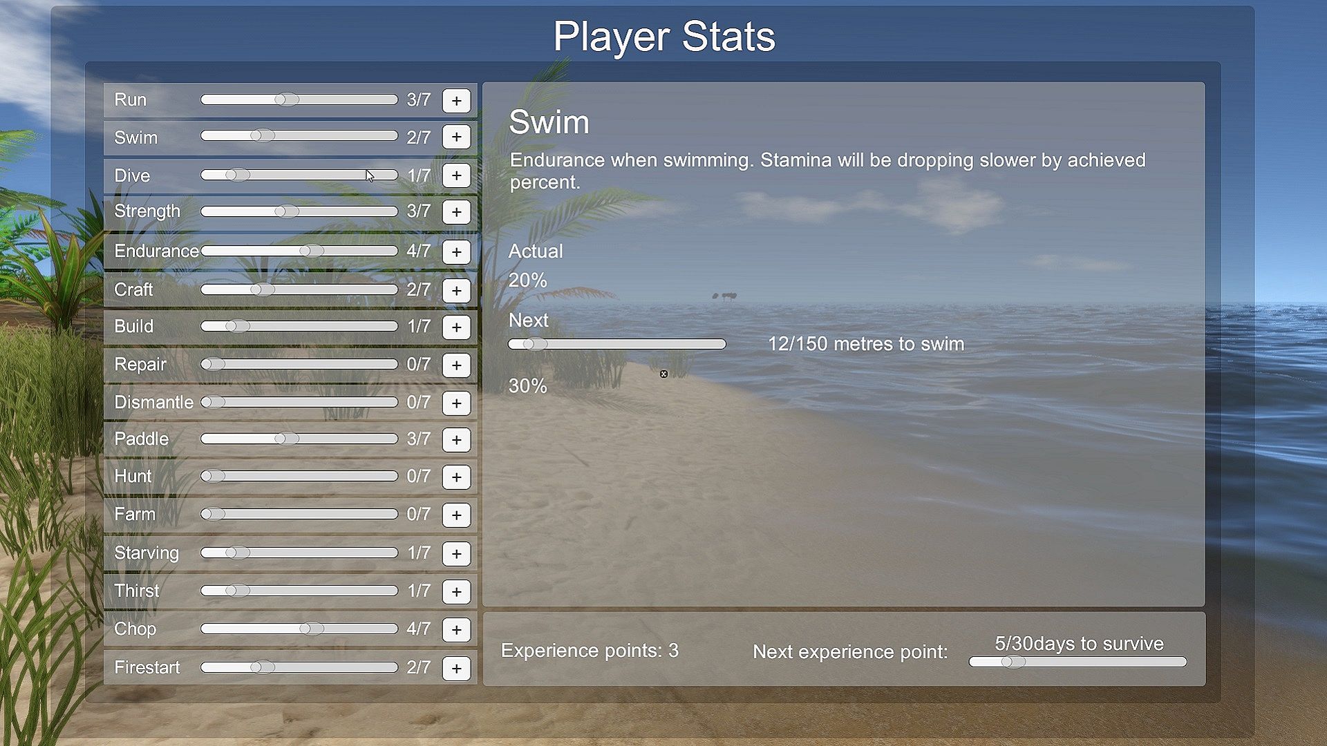 Weather data from the real Pacific is implemented in the game. With up to 27 different weather factors the player can simulate a plethora of realistic scenarios: Hot, cold, dry, windy, calm and many more combinations. The in-game weather (wind, temperature, rain etc.) and seasons are based on the day of the year and the actual latitudinal position of the player on the global map. Items can get wet, and while wet wood is perfect to smoke food, it can be deadly when the player is suffering from starvation and can’t light up a fire. Everything is dynamic in this game. While the strong wind is perfect for sailing, it can cause the rain to fall at an angle and reach the inside of a building through a window.