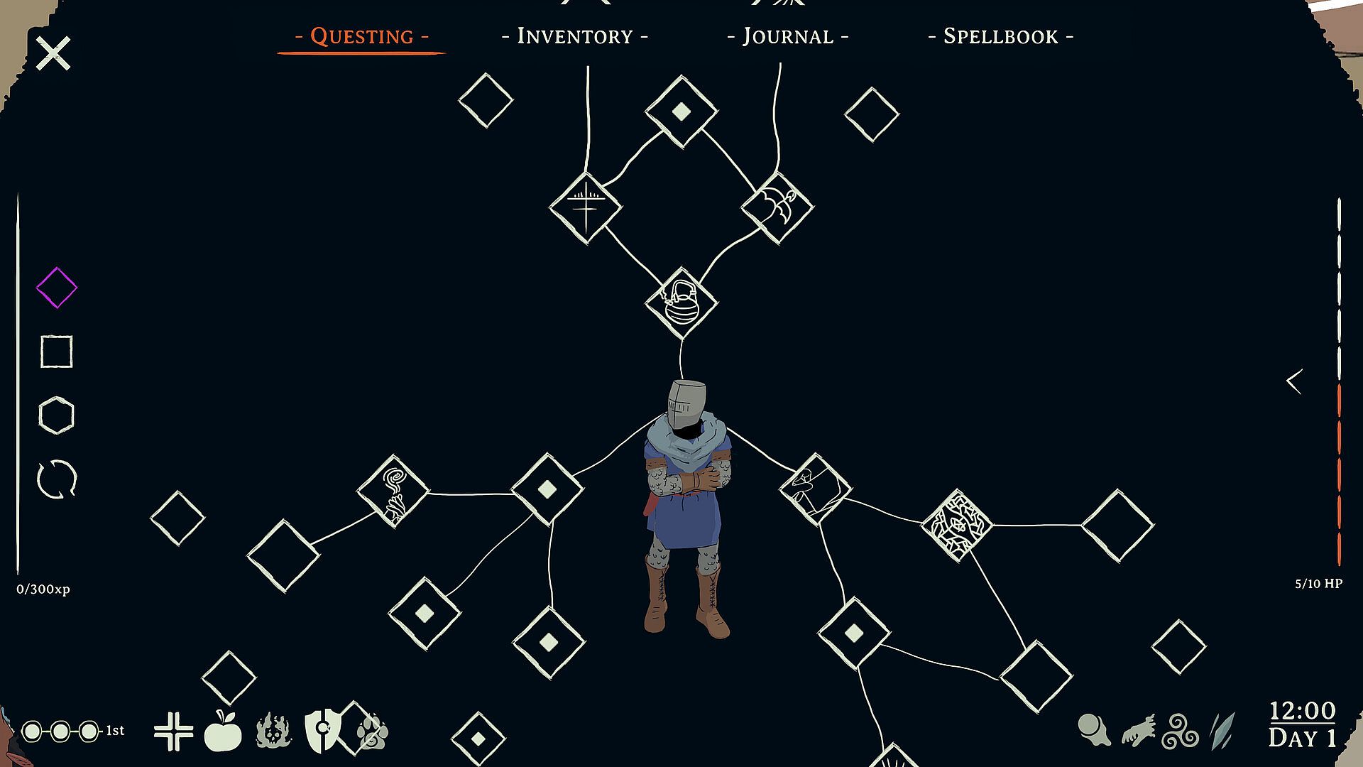• THE QUESTING TREE. Your quest log, skill tree, and mind map all at once. Each Quest Branch can take root in your mind and alter The Cleric’s playstyle through game-changing feats.