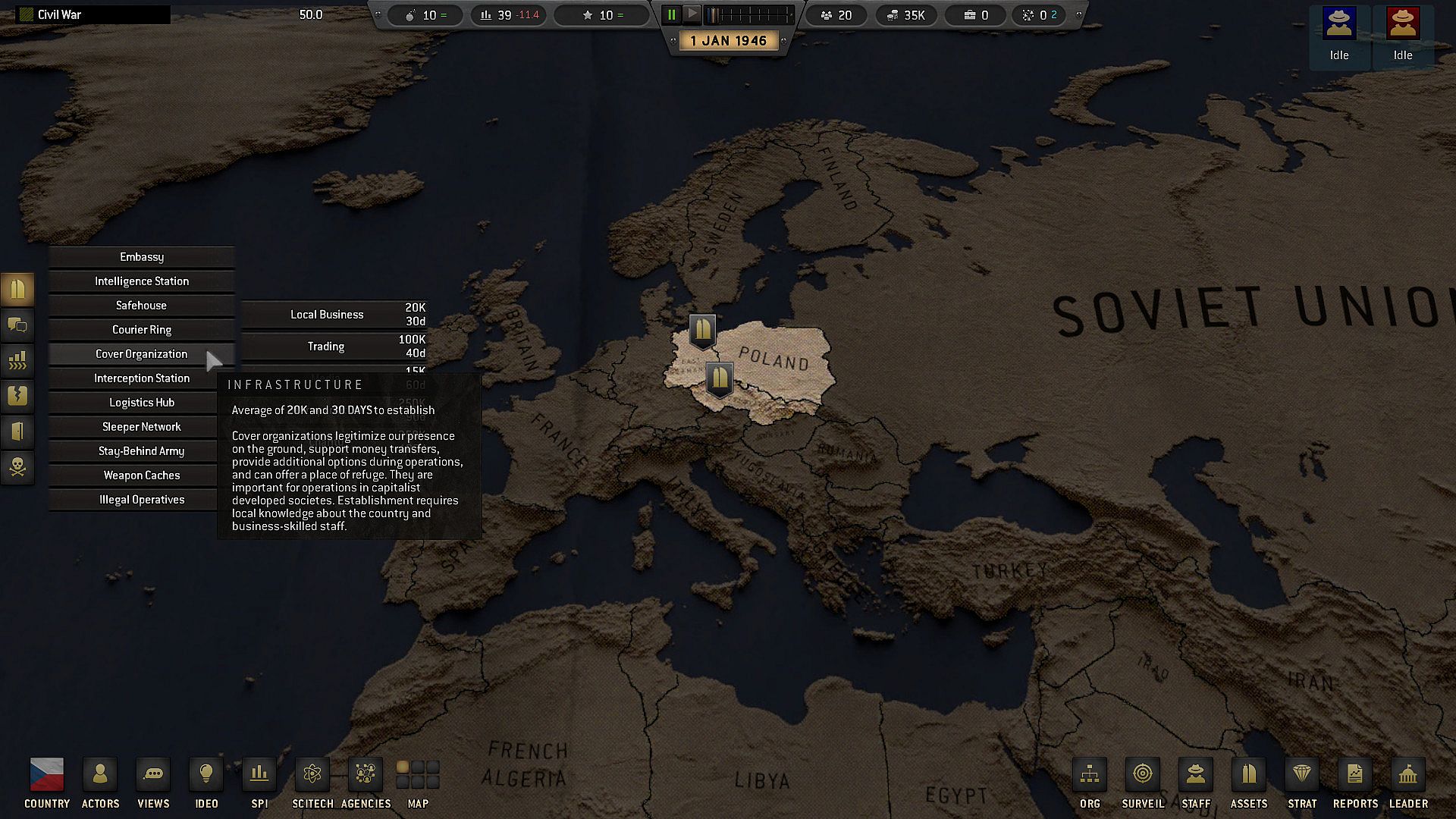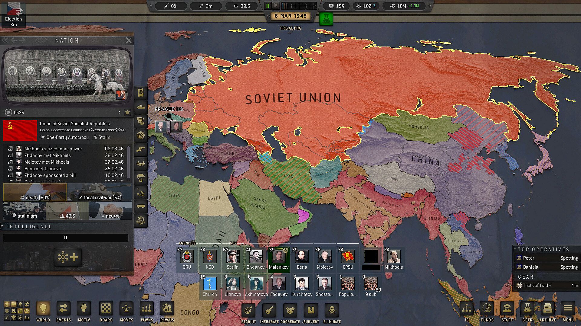 Make use of 34 different types of operations: install operatives in foreign agencies, use propaganda to spread ideologies, and perform assassinations. Hand-pick and develop your own cadre of top-level operatives. Some are more technologically inclined, while others are experts at manipulating people and their emotions.