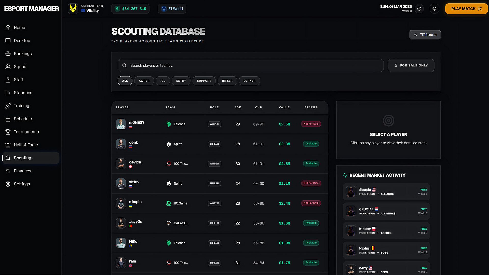 • Global player database with roles, stats, and potential