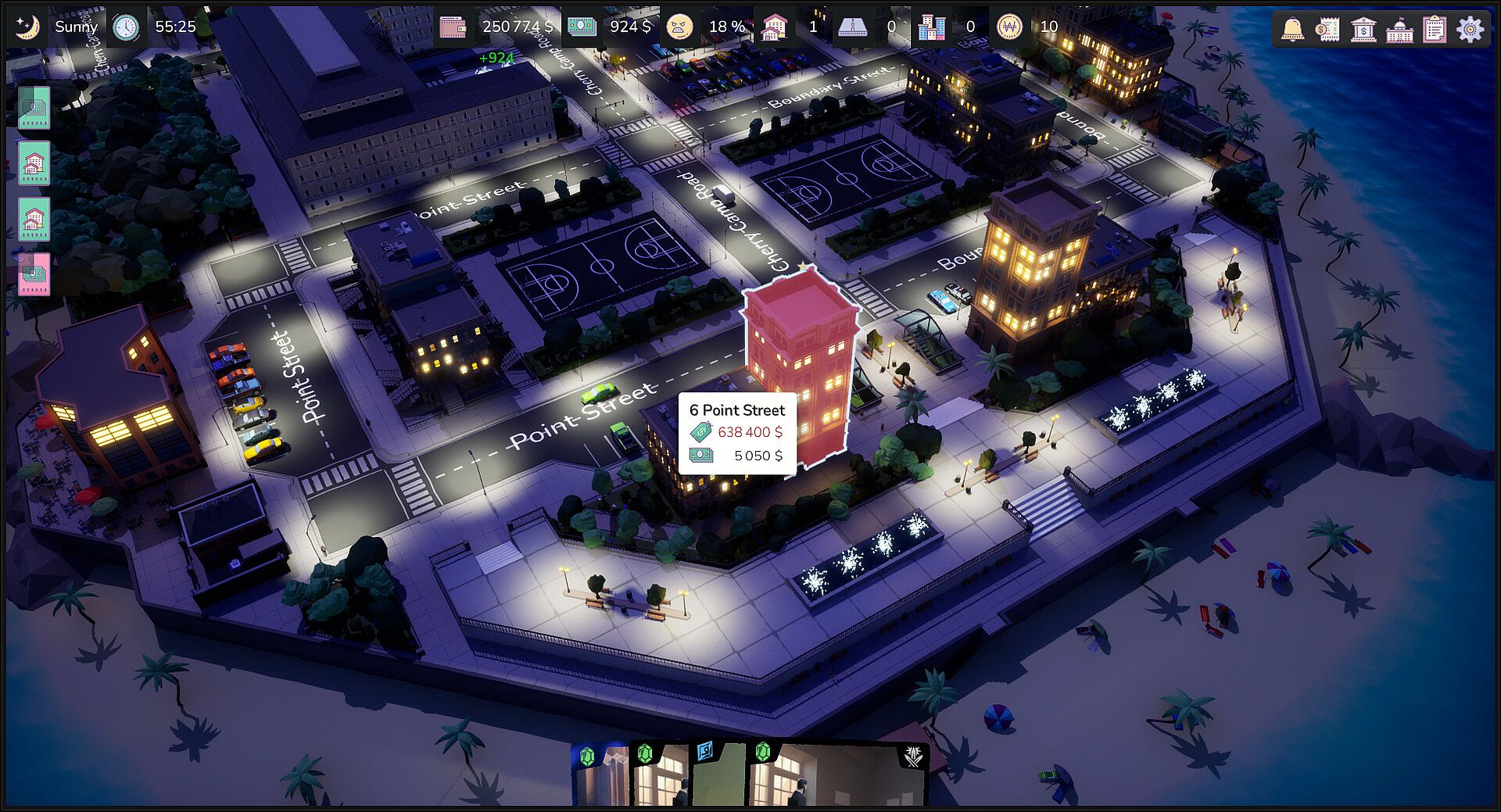 Each street and districts has its own advantages that will influence your properties. It can provide you with bonuses or penalties, such as more income but slower upgrades. You will need to be cautious about these factors when purchasing properties. Streets and districts can be owned by possessing the majority of properties on a street and the majority of streets in a districts. Owning a street or districts will grant you more bonuses.