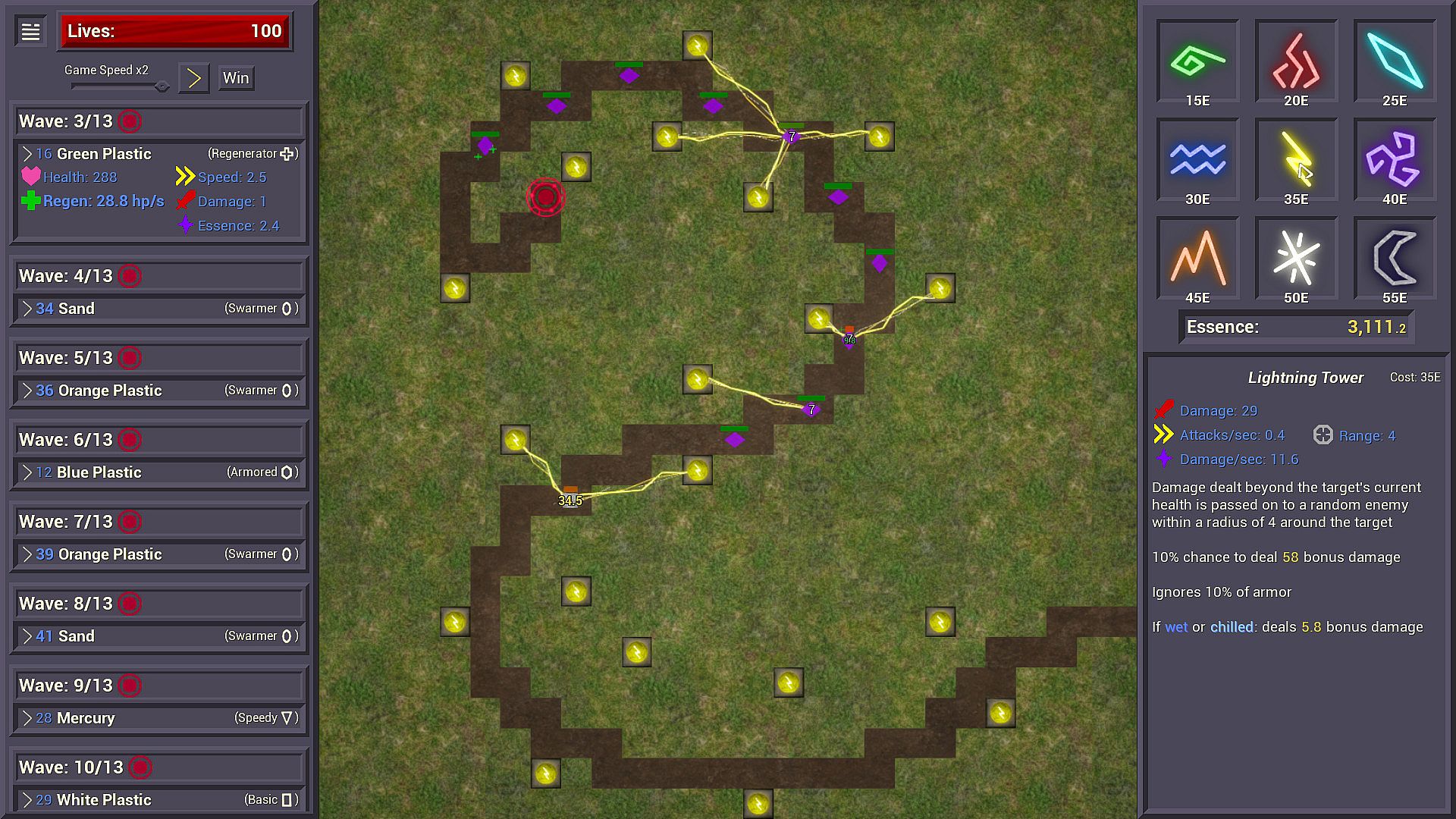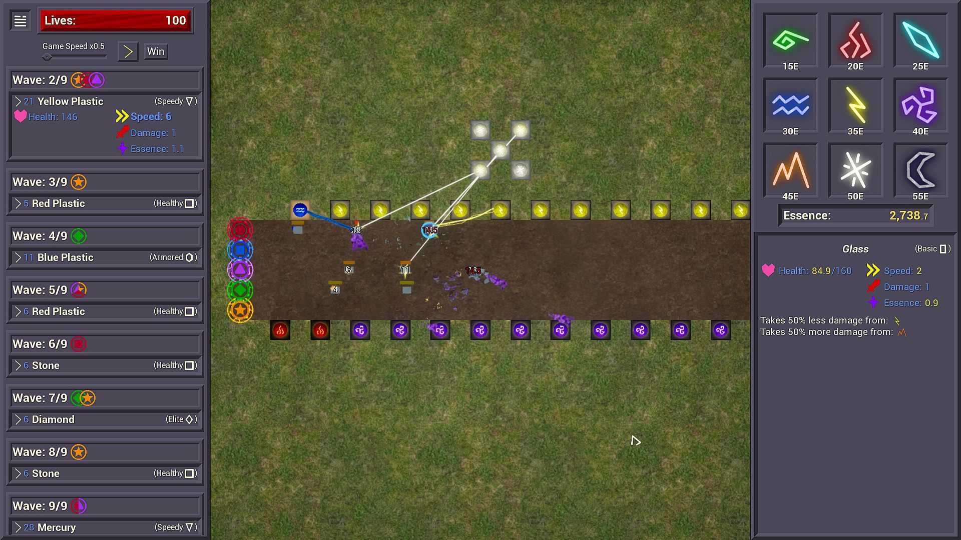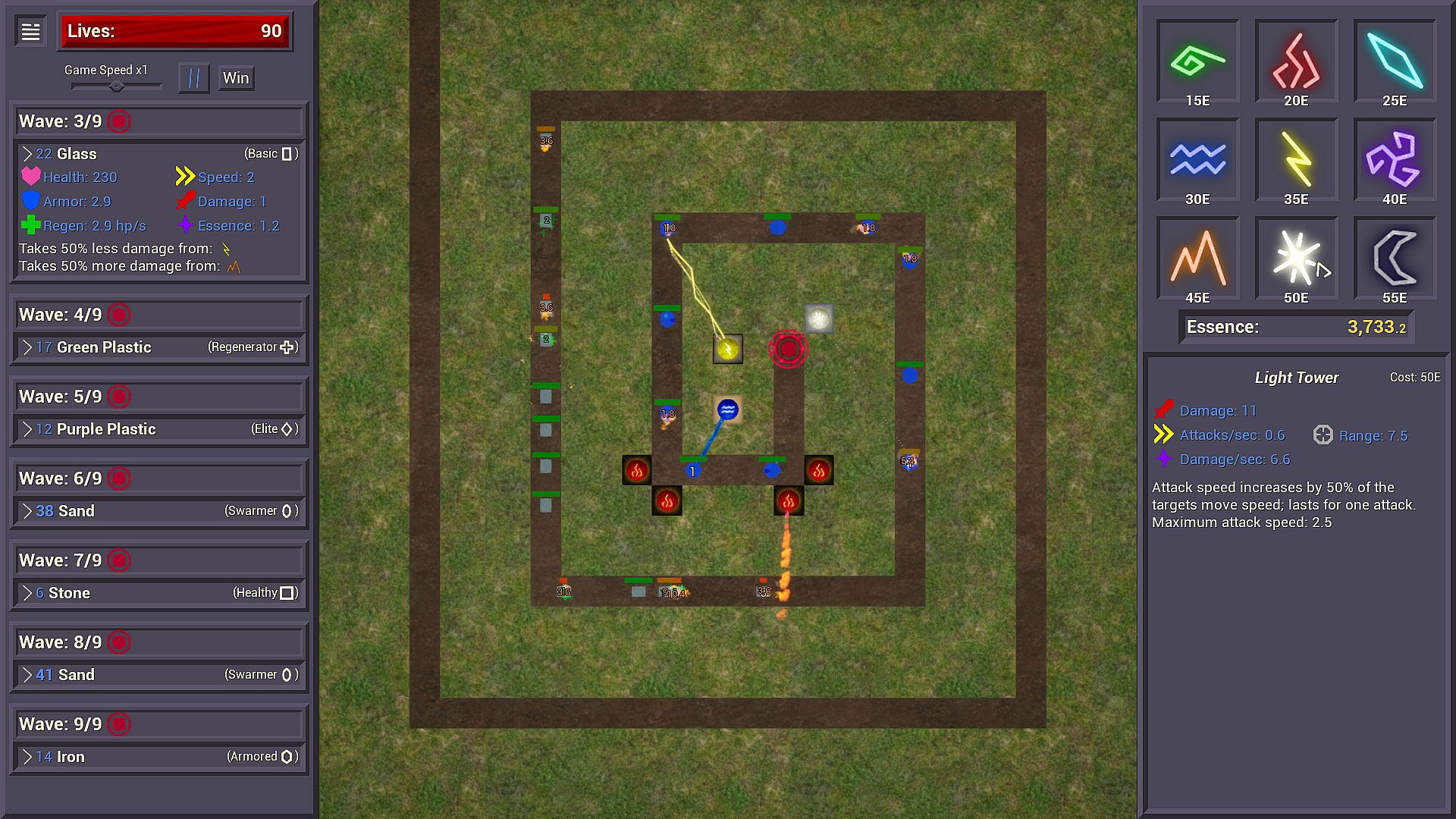 In Eternal Elements, the core loop revolves around placing elemental towers to defend against incoming waves of material enemies. Each tower represents an element that interacts uniquely with others and with foes, such as eroding stone, freezing water, melting sand, shattering glass, or corroding iron. You must experiment with these combinations to find effective strategies for each map, as every tower has strengths and weaknesses matched against specific enemies.