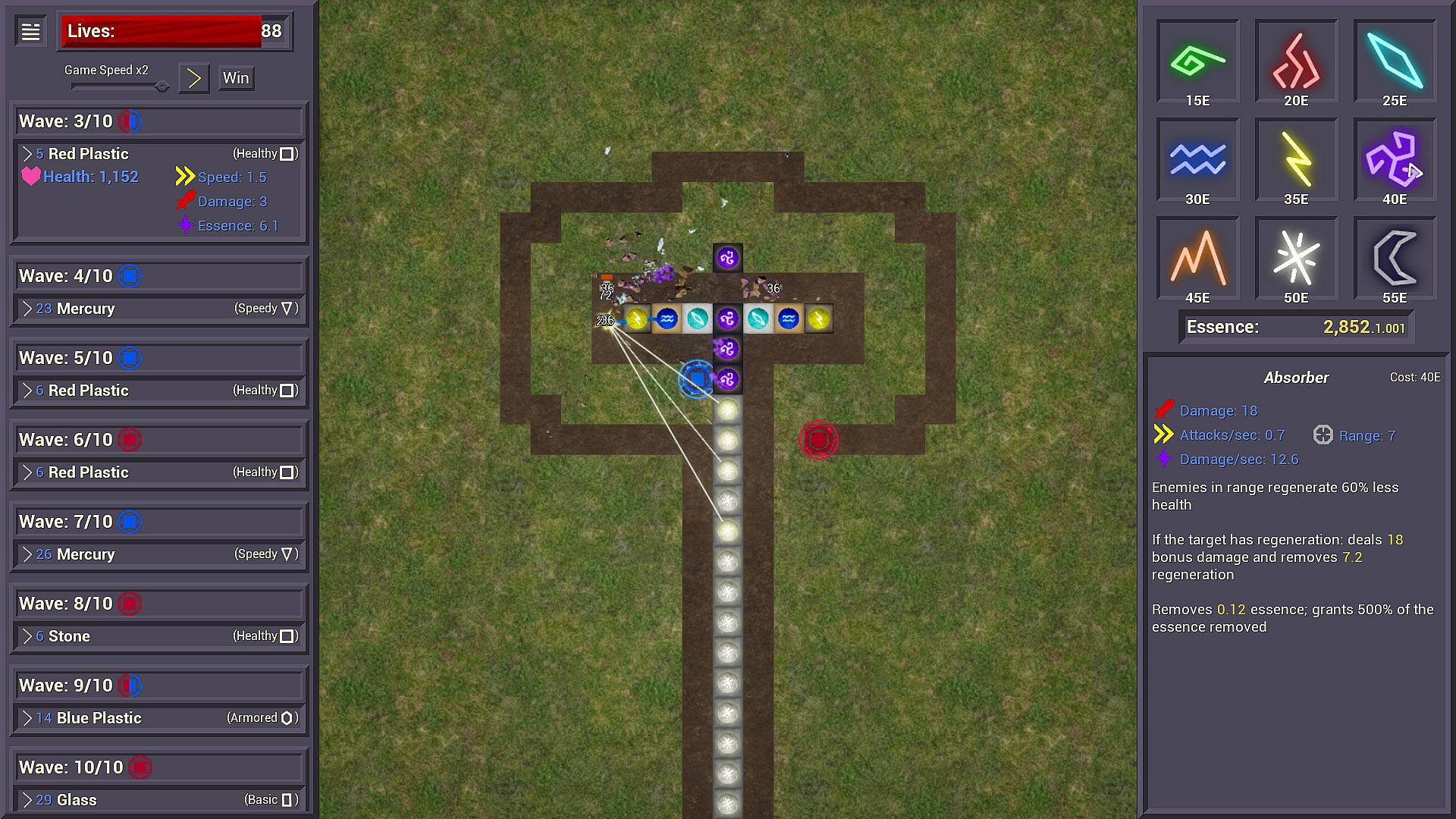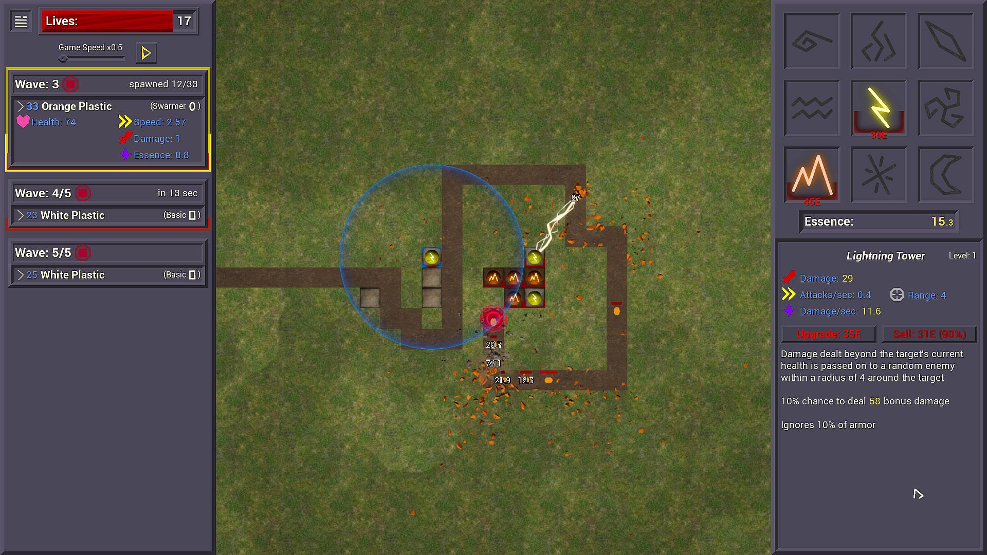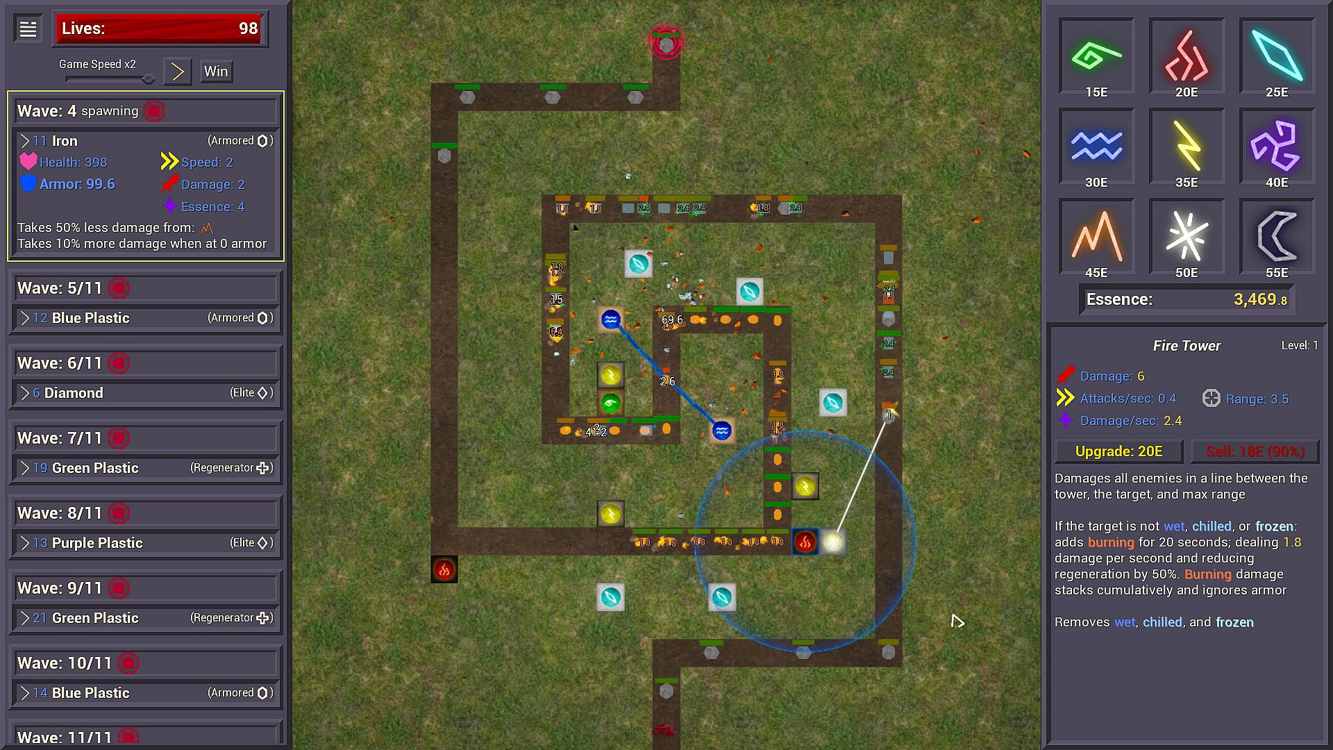 In Eternal Elements, the core loop revolves around placing elemental towers to defend against incoming waves of material enemies. Each tower represents an element that interacts uniquely with others and with foes, such as eroding stone, freezing water, melting sand, shattering glass, or corroding iron. You must experiment with these combinations to find effective strategies for each map, as every tower has strengths and weaknesses matched against specific enemies.
