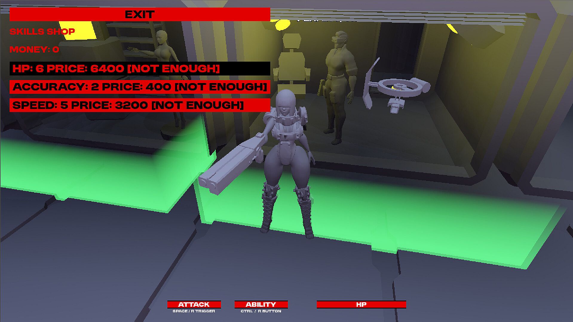 • A hub area where you can buy new gear and upgrade your skills.