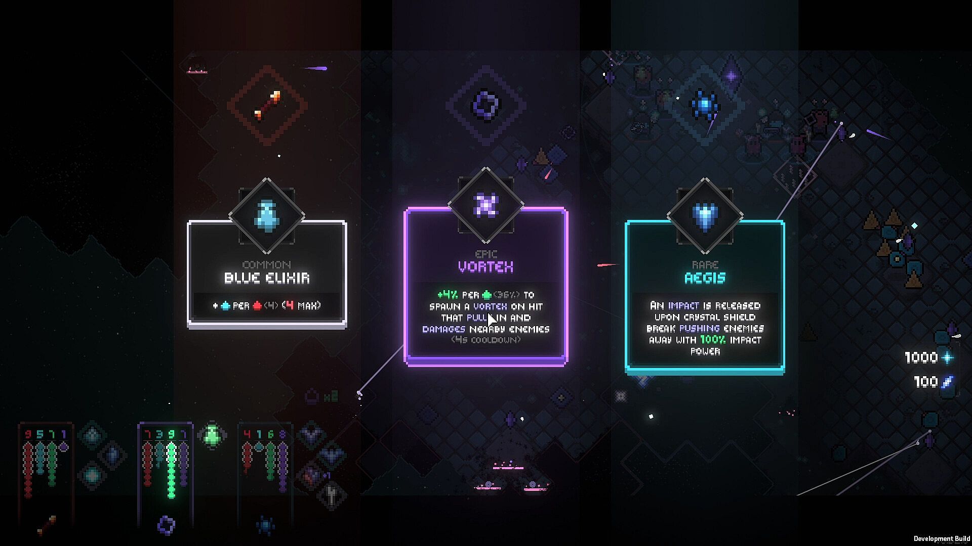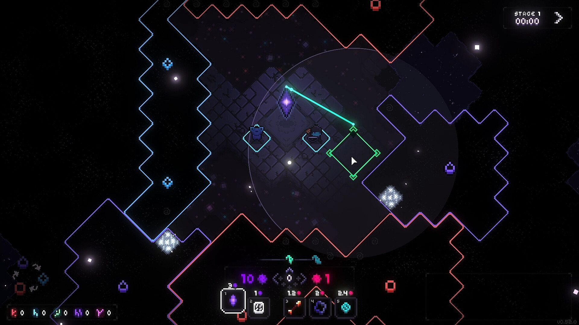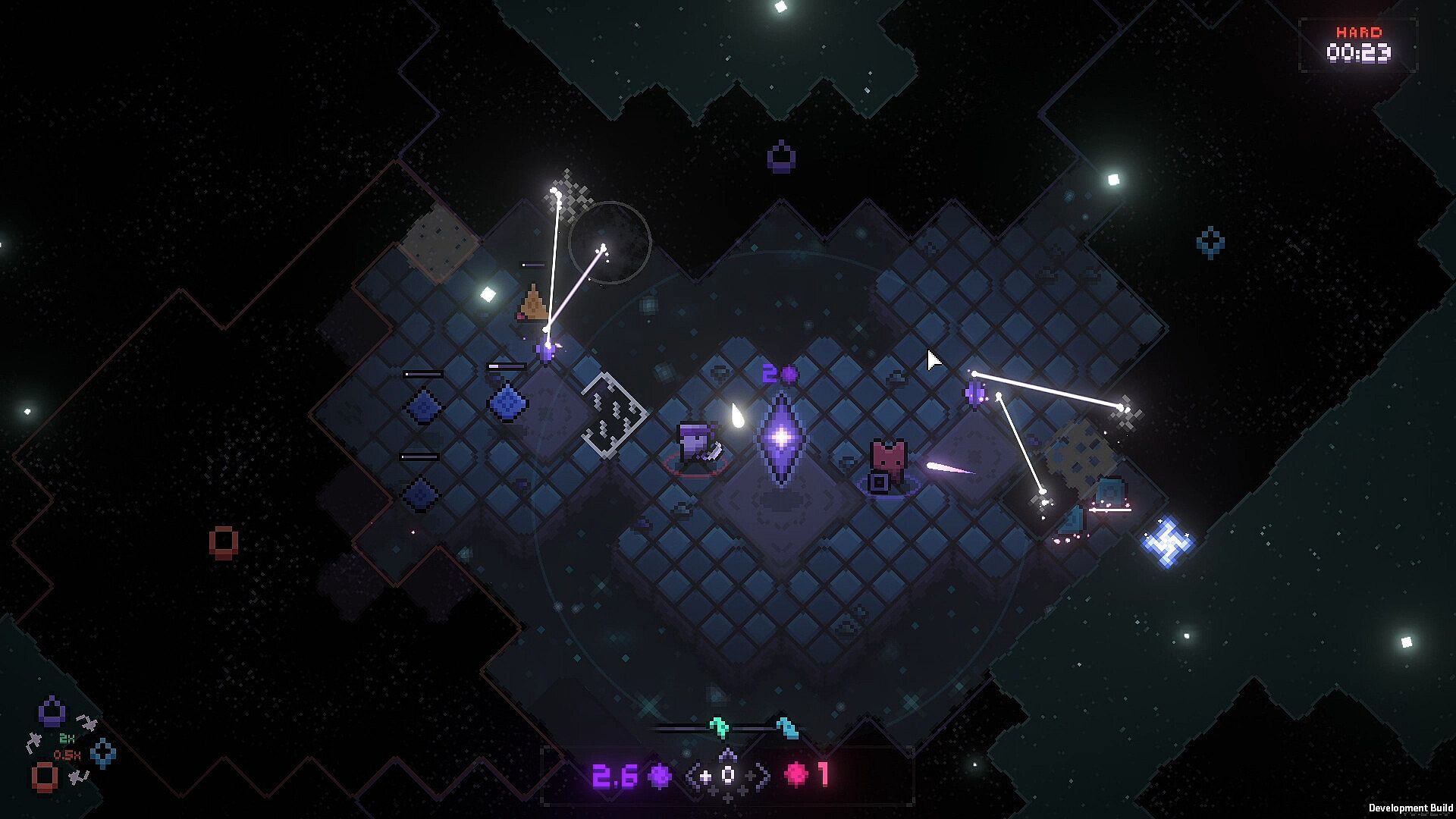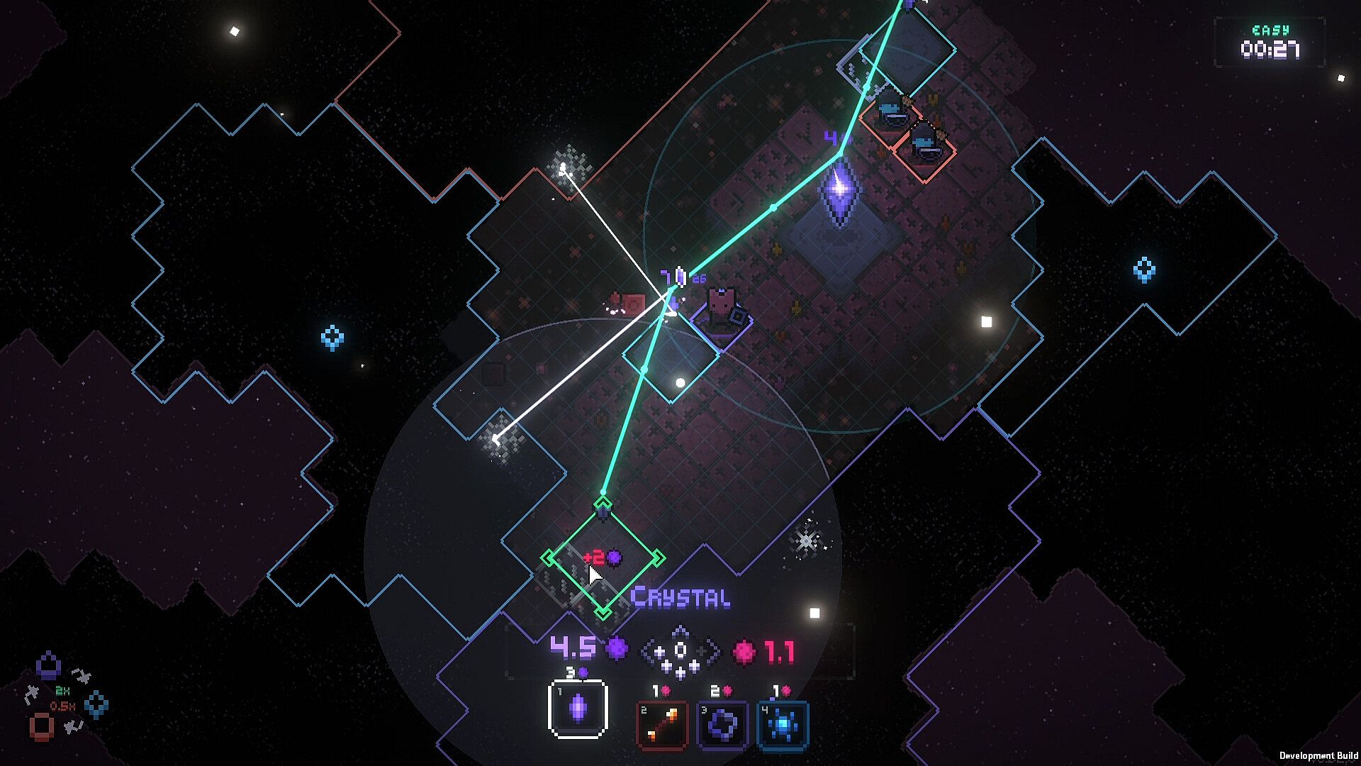 Every run starts with your crystal and a supply of energy. Then it's up to you how to fight the darkness. Do you steadily expand, clearing the darkness, harvesting its energy, and carefully deploying defenders to deal with whatever emerges from the dark? Or do you play it fast and loose, striking out to locate ancient structures and powerful artifacts hidden within?