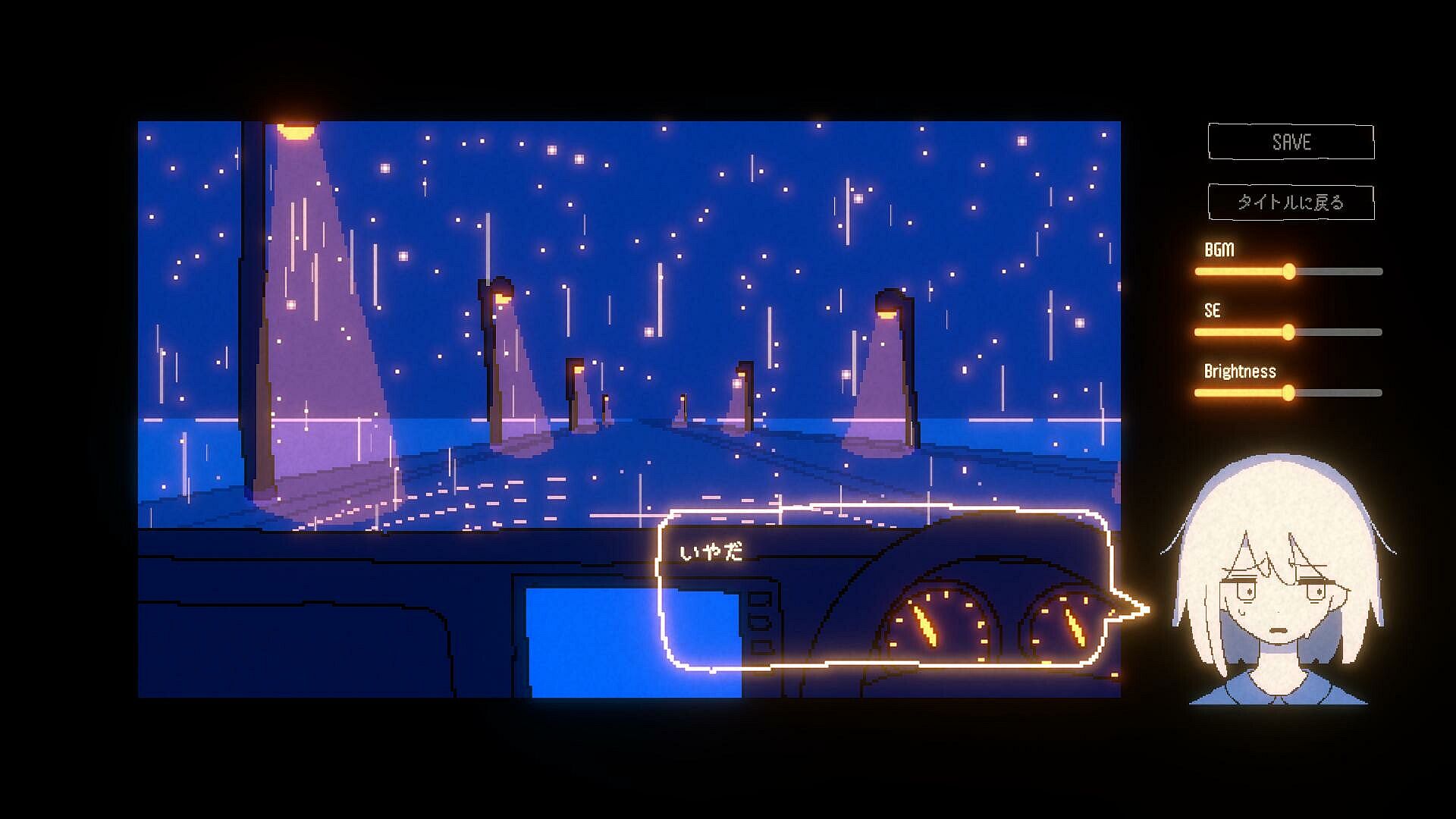 This is a short multi-ending novel game where you talk to a girl during while taking a drive by night. Talk to her, listen to her, and try to understand her.