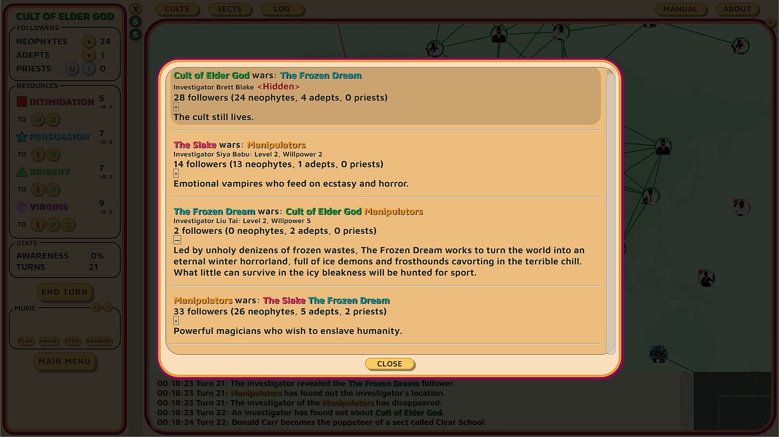 Evil Cult is a turn-based strategy game about various sinister cults all vying for world domination. Whether through completing the Final Ritual or eliminating all opponents, the victory will not be easy. Managing a cult is a tricky job, you see. Pesky investigators, multiple offspring sects, bloodthirsty opponent cults, these are all threats that have to be dealt with or successfully evaded. And all that has to be done below the radar of the human society.