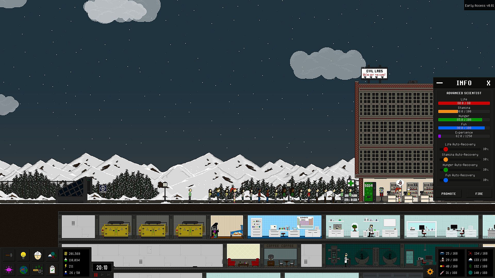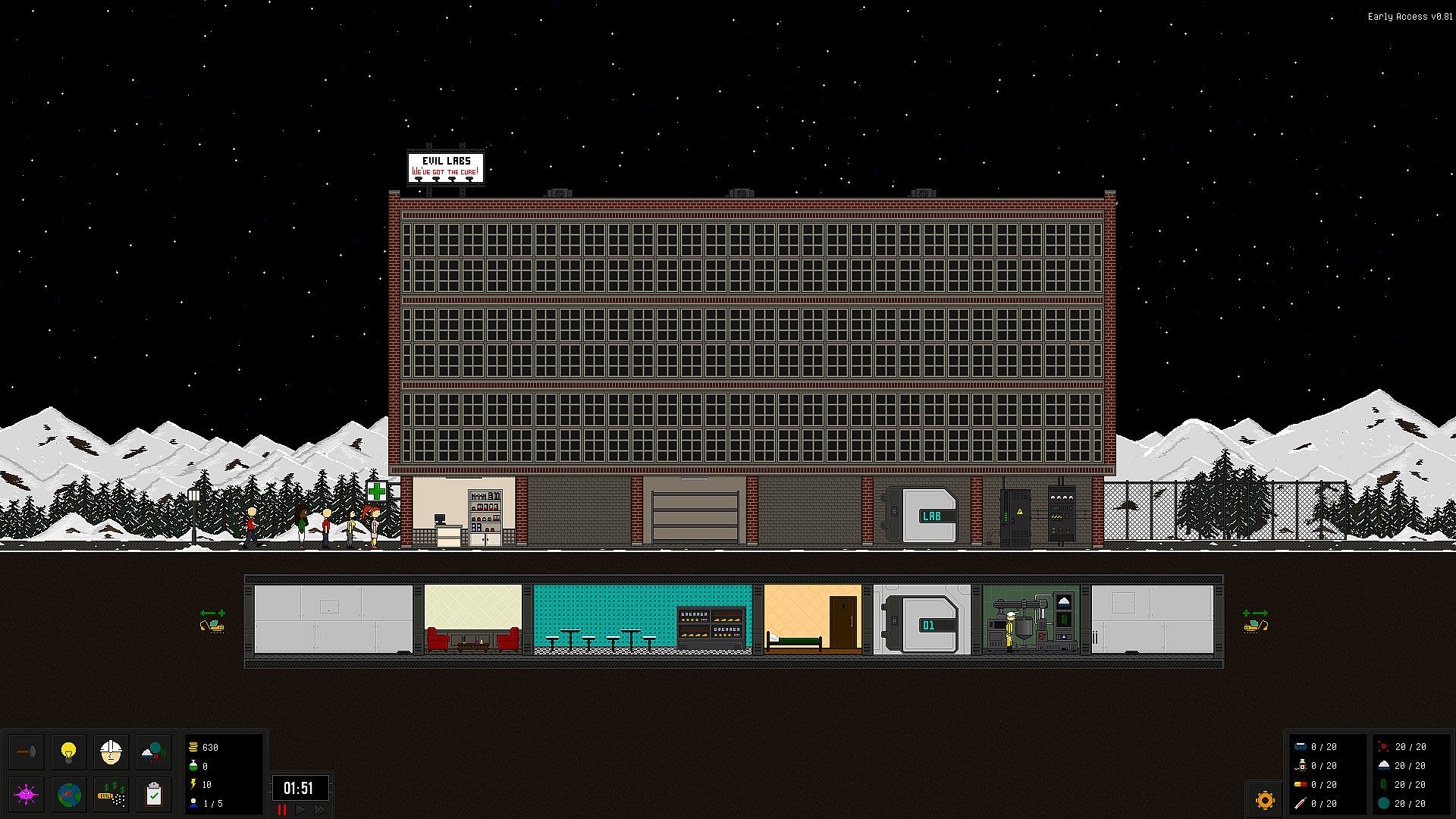 Build and improve your own lab with dozens of buildings types and upgrades, like: laboratories, bedrooms, messhalls, security, offices, power generators, factories and the list goes on...