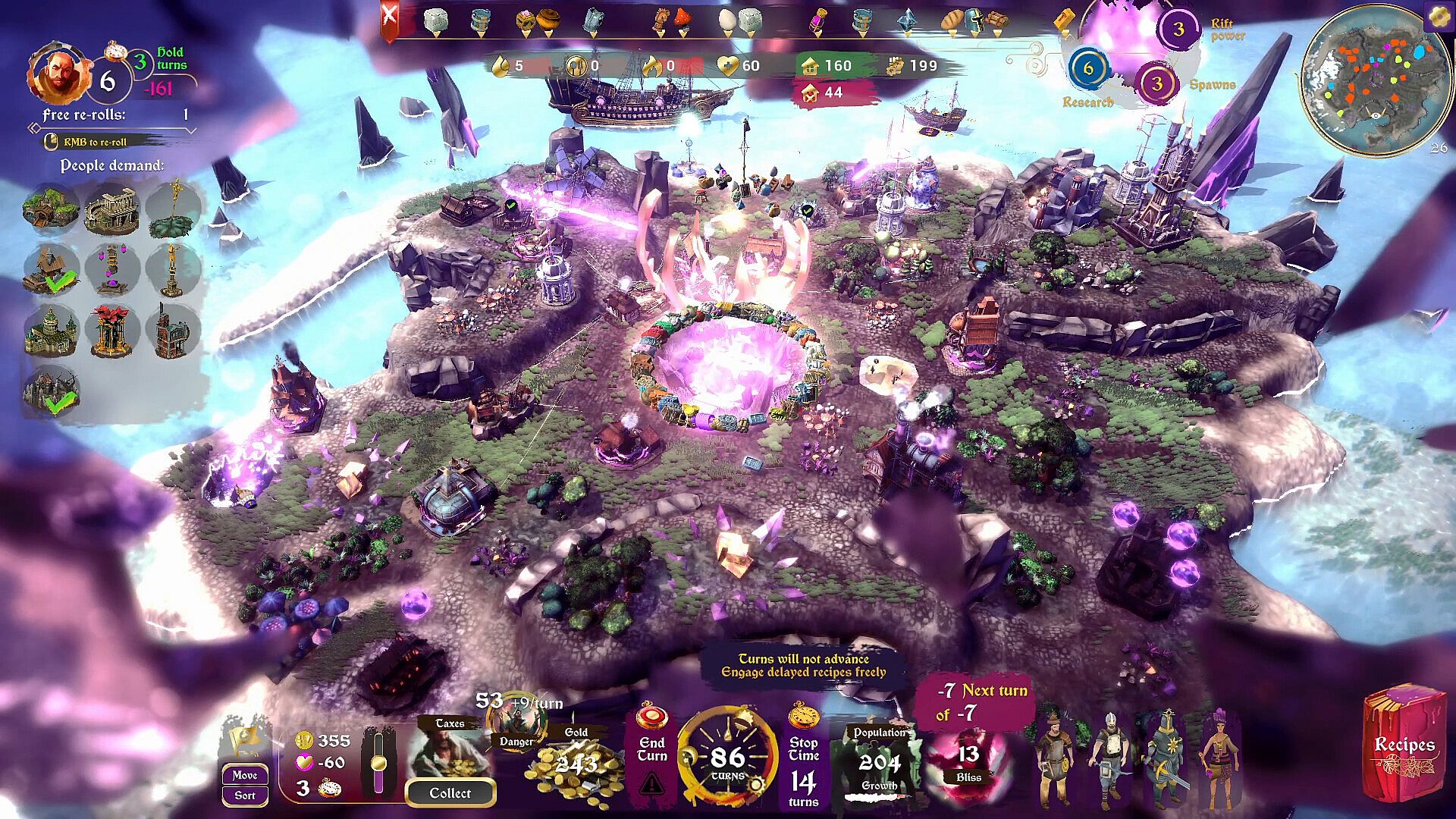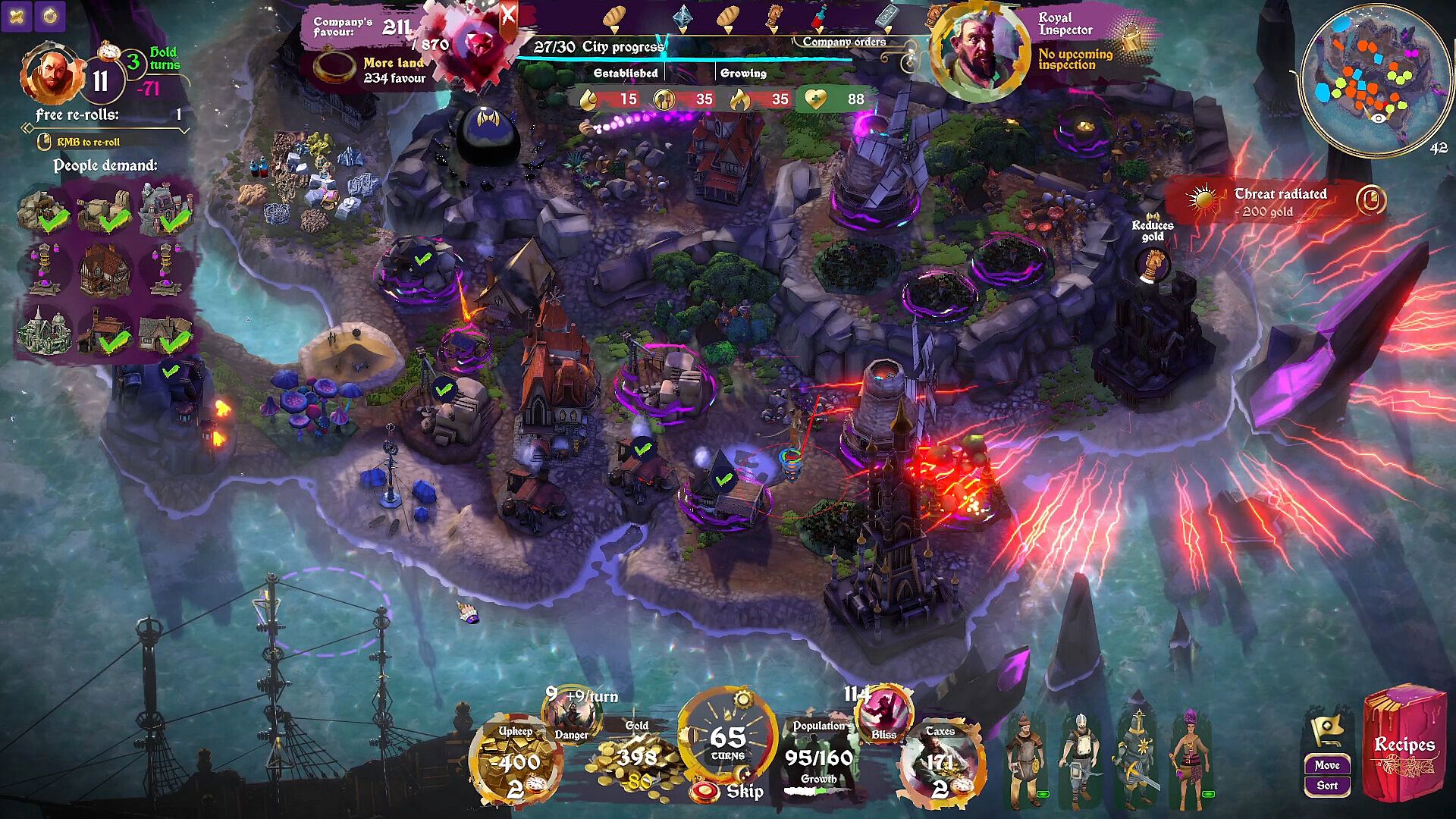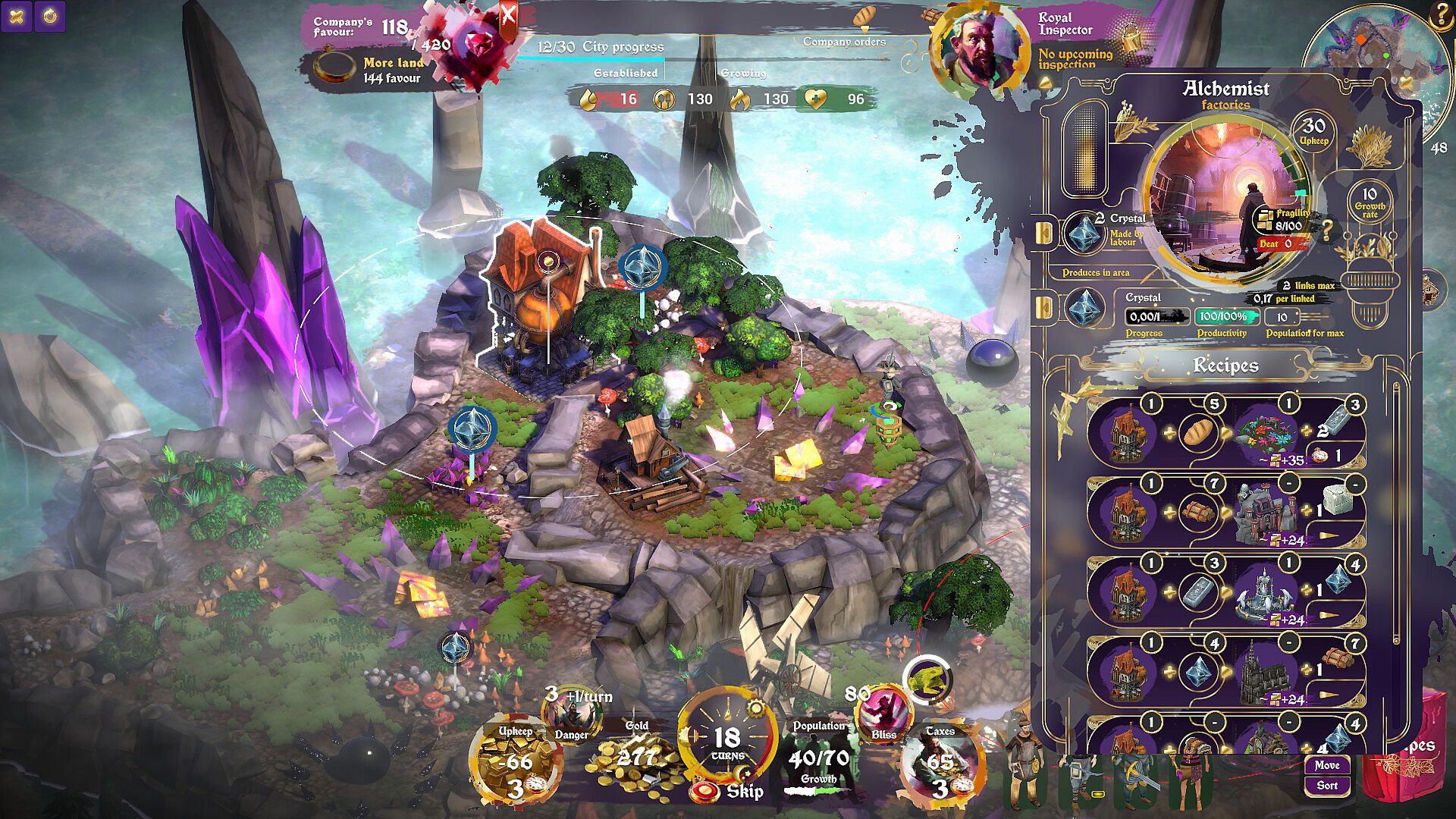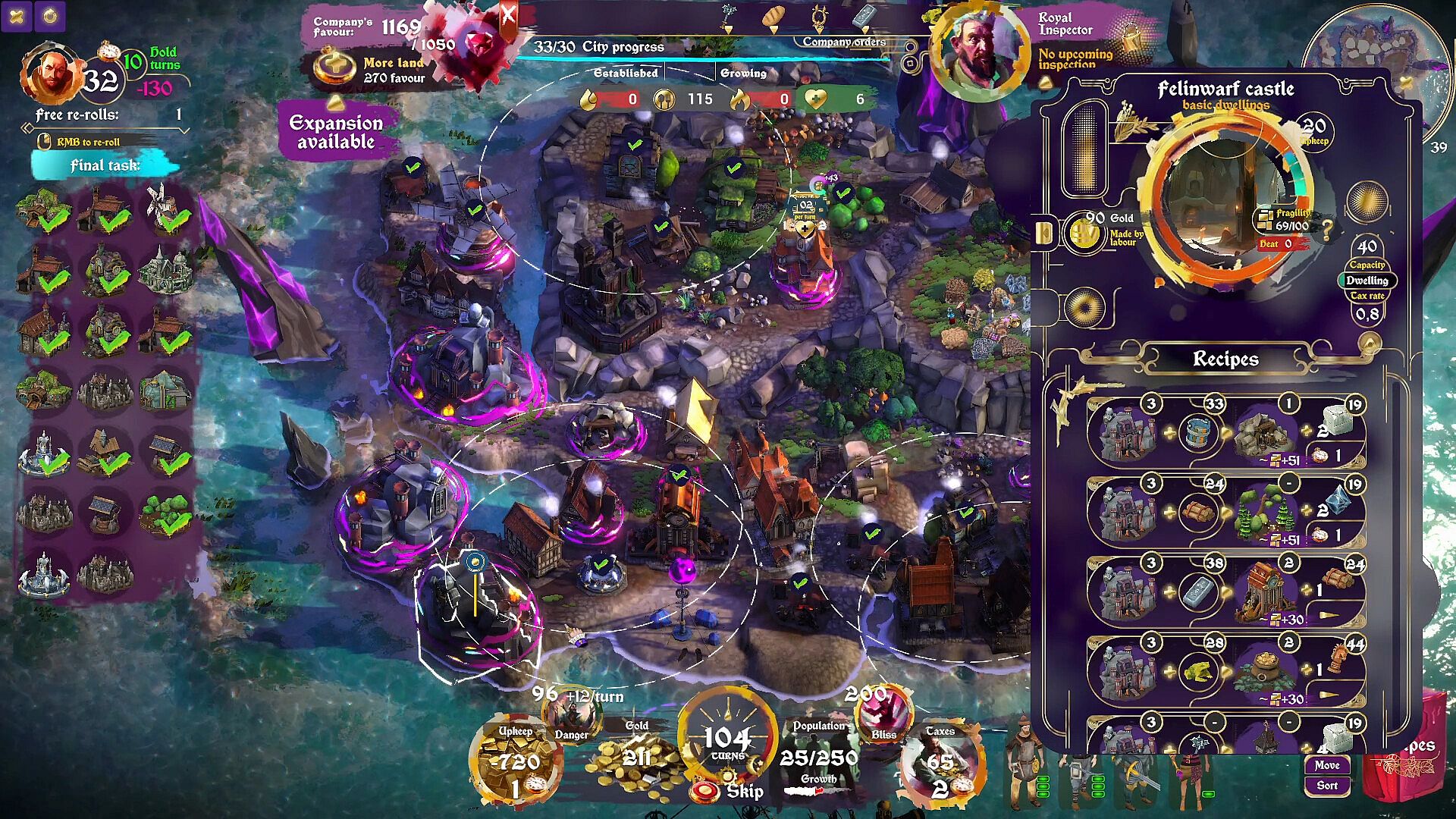 We combined a city-building simulator and crafting alchemy game to get an interesting turn-based strategy. In this game, you do not just build buildings, but change those that are there into the ones you need, spending and receiving resources.