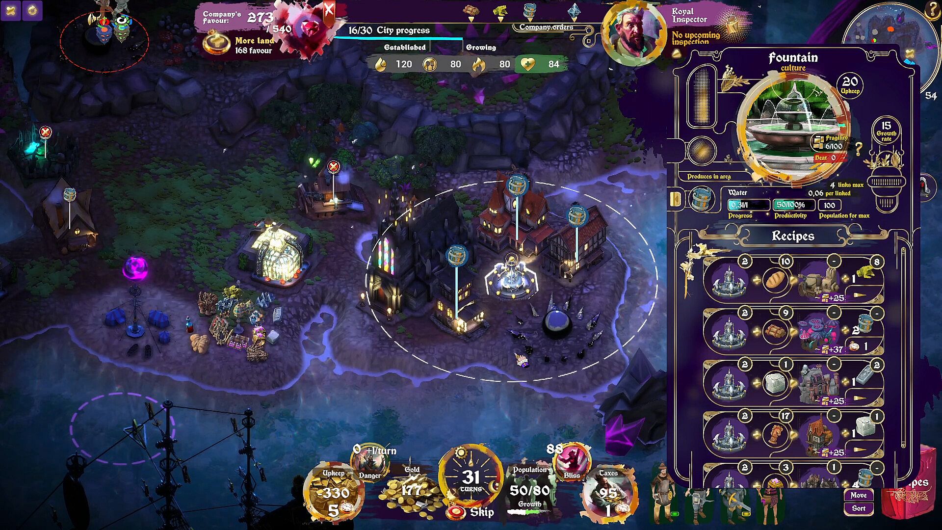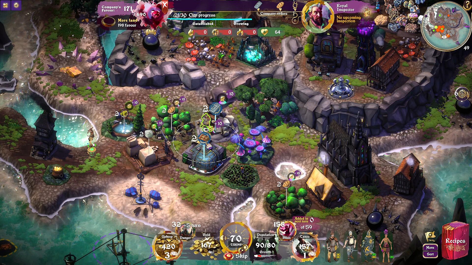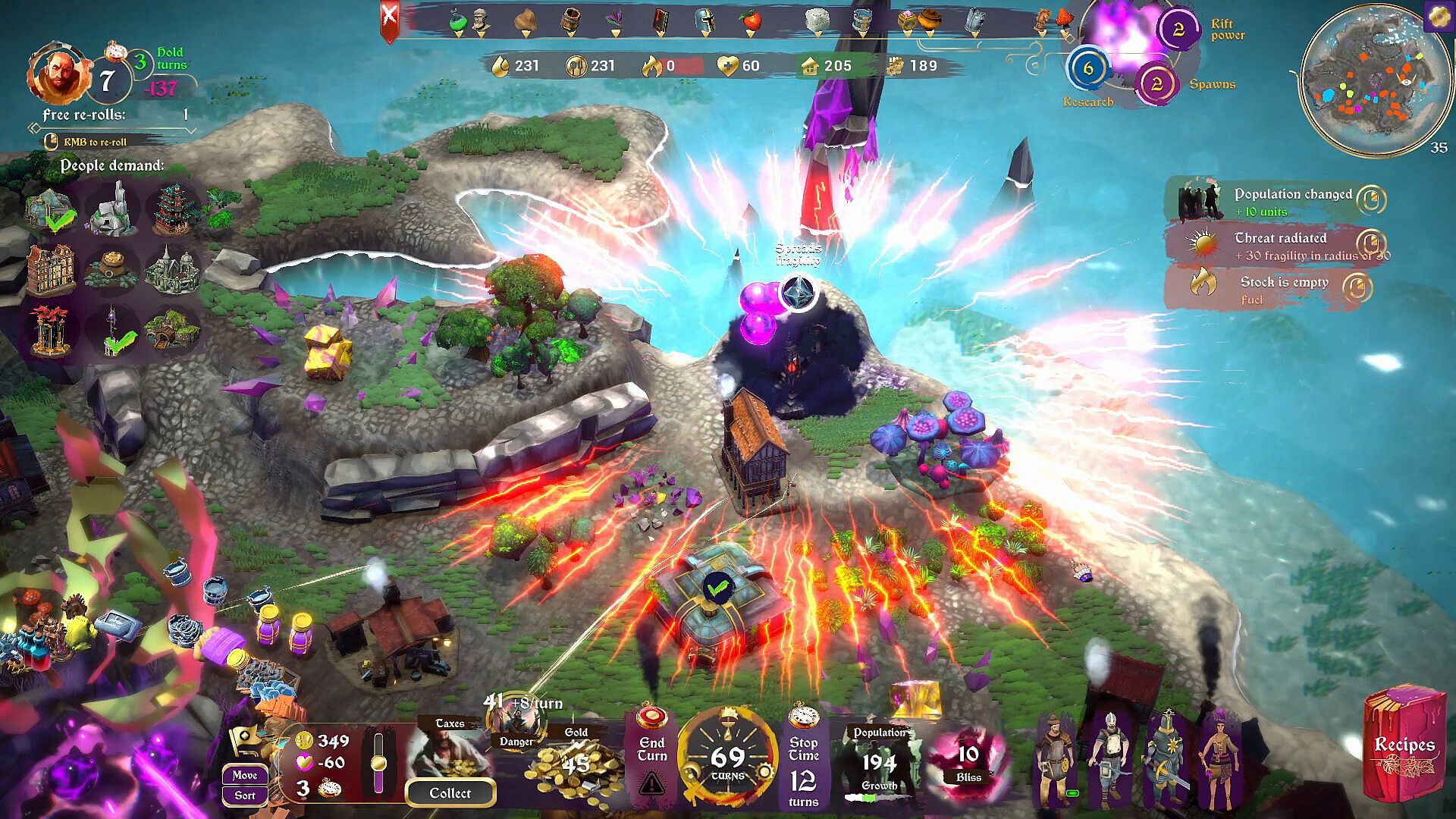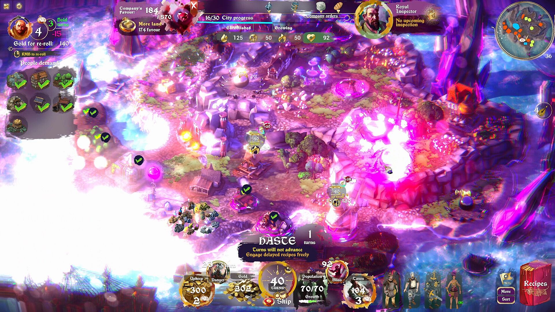 We combined a city-building simulator and crafting alchemy game to get an interesting turn-based strategy. In this game, you do not just build buildings, but change those that are there into the ones you need, spending and receiving resources.