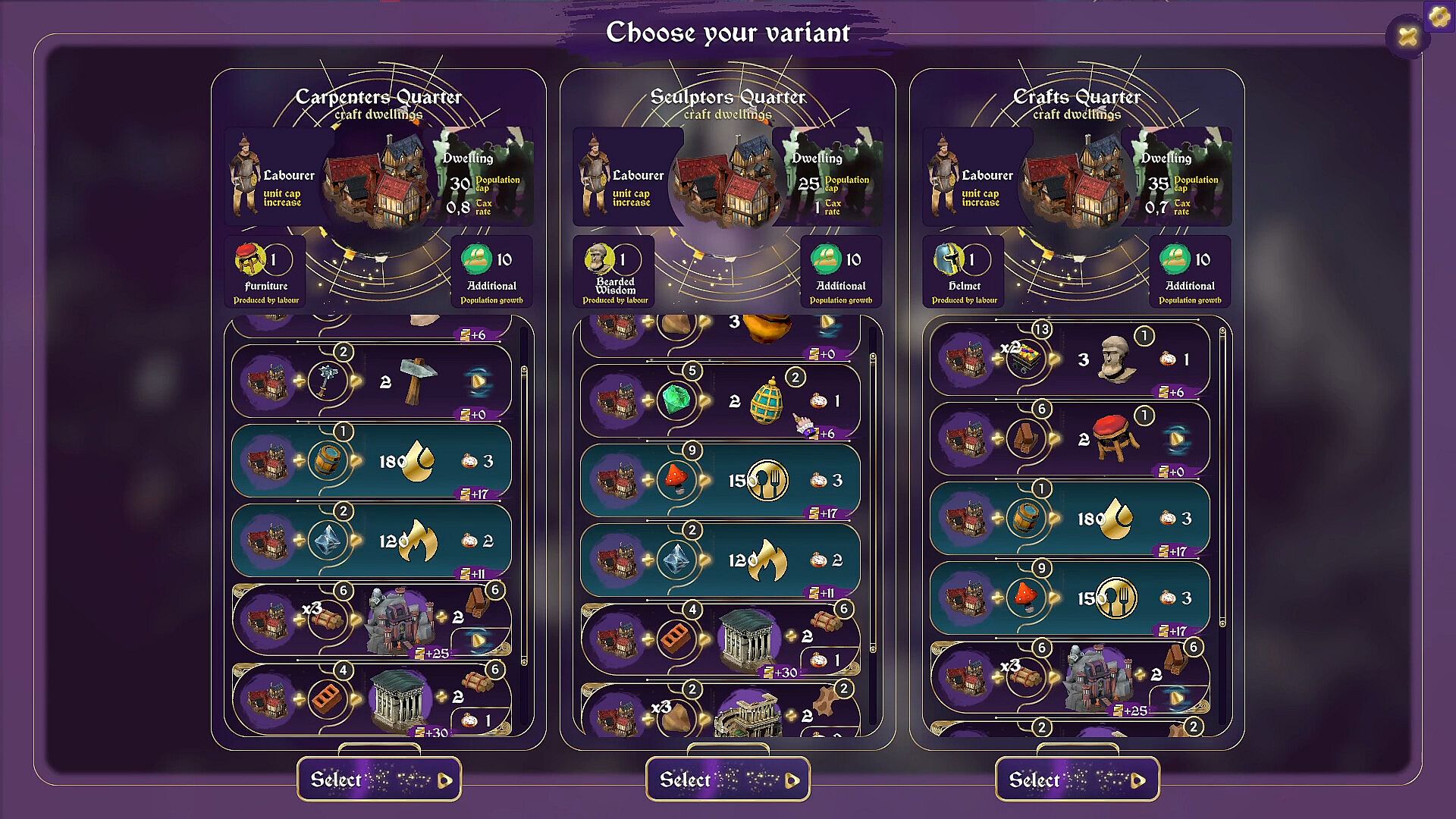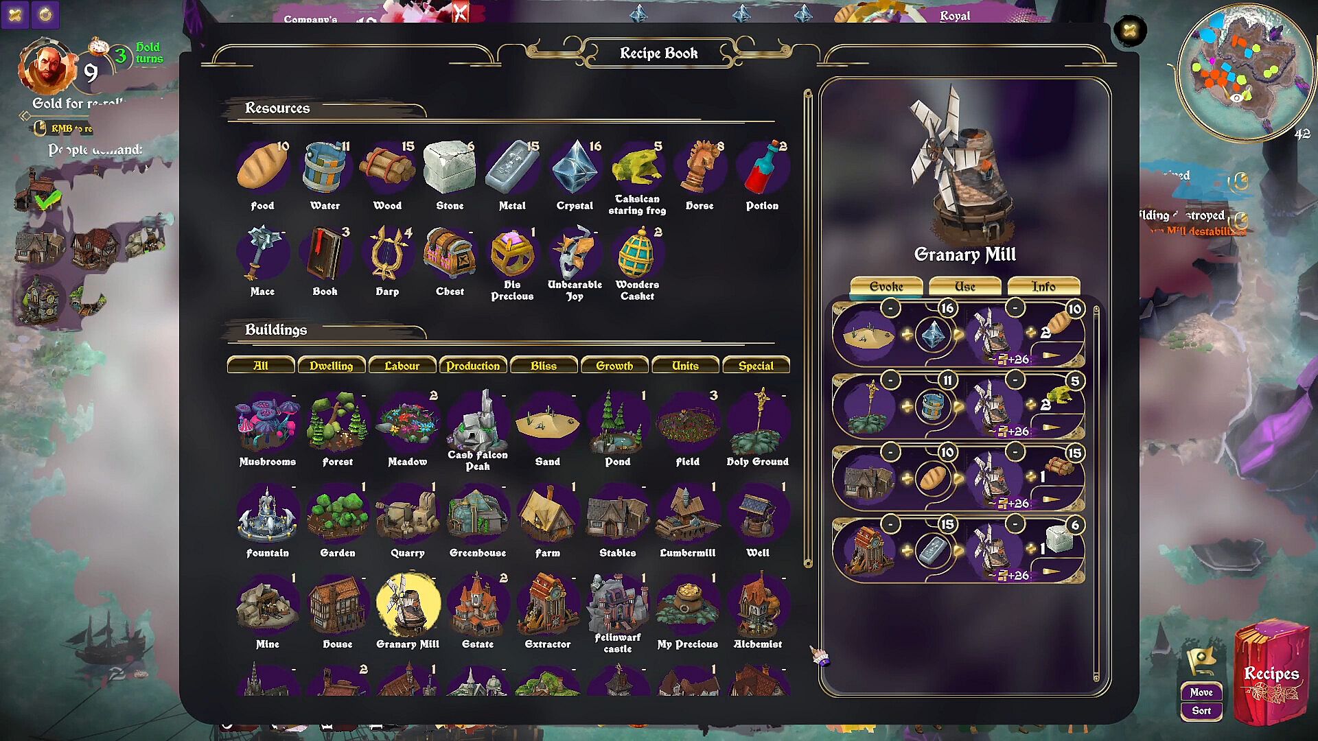 Each building can be obtained from several recipes and used in a number of recipes to obtain another building and/or resources, including units and other valuables. Thus, the same building can cost different amounts of different resources and require different amount of turns to obtain.