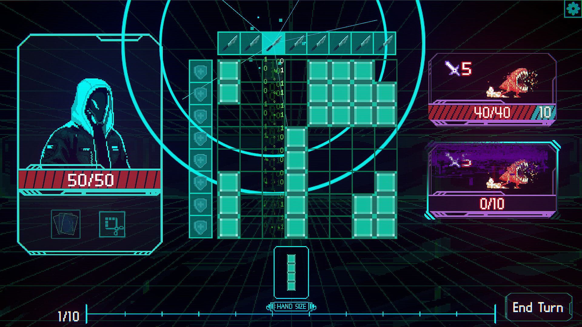 Place data blocks on an 8×8 grid and rotate 4×4 areas to complete lines. When a line is completed, equipment activates, triggering attacks, defenses, or various special effects.