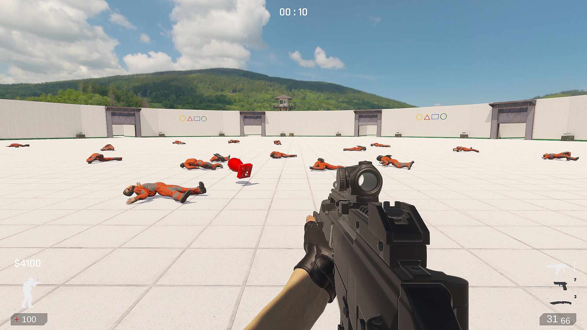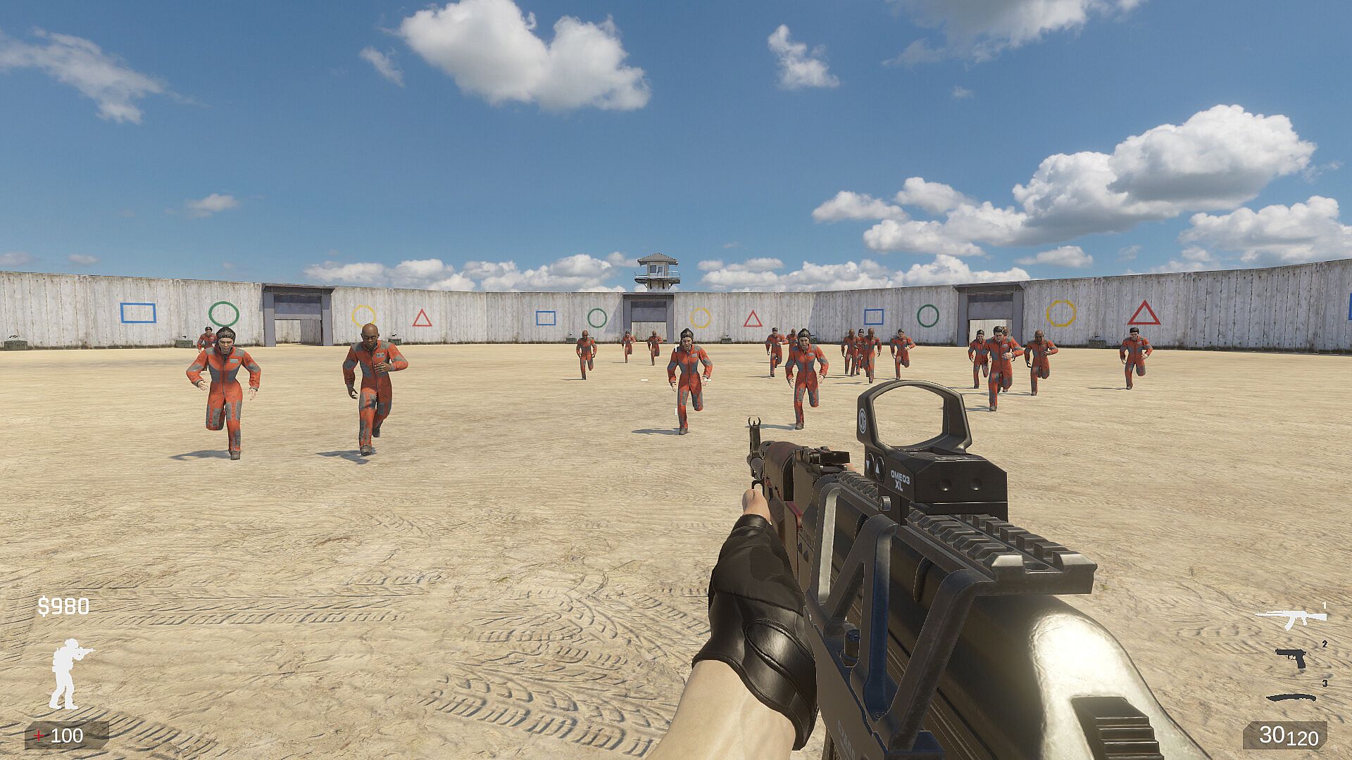 Weapons are stored in green boxes under the high walls around the prison, and you can buy them as needed.