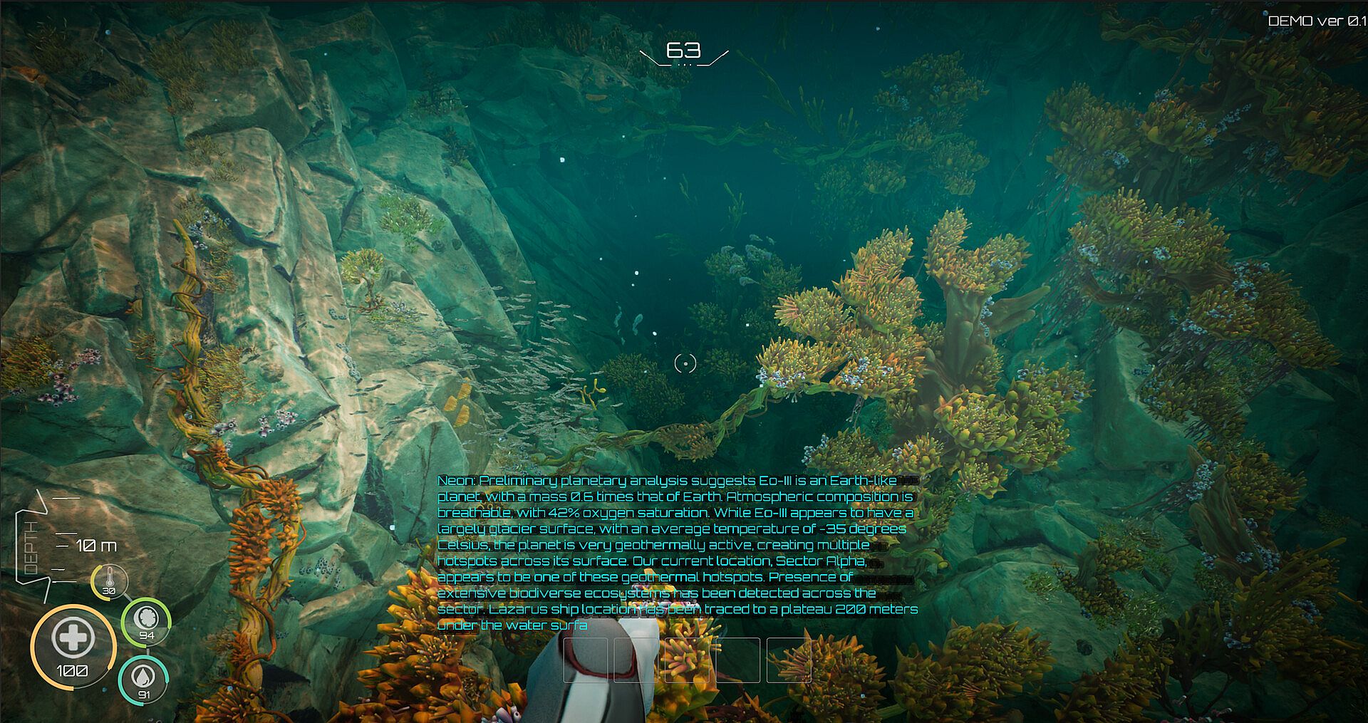 Planet Eo-III is home to many biodiverse ecological systems brimming with vibrant fish but also dangerous predators. Every biome in Sector Alpha is different, from lush and sunny coral reefs, to deep and dark ravines and caverns, you need to learn about how each zone works in order to survive and dive deeper.