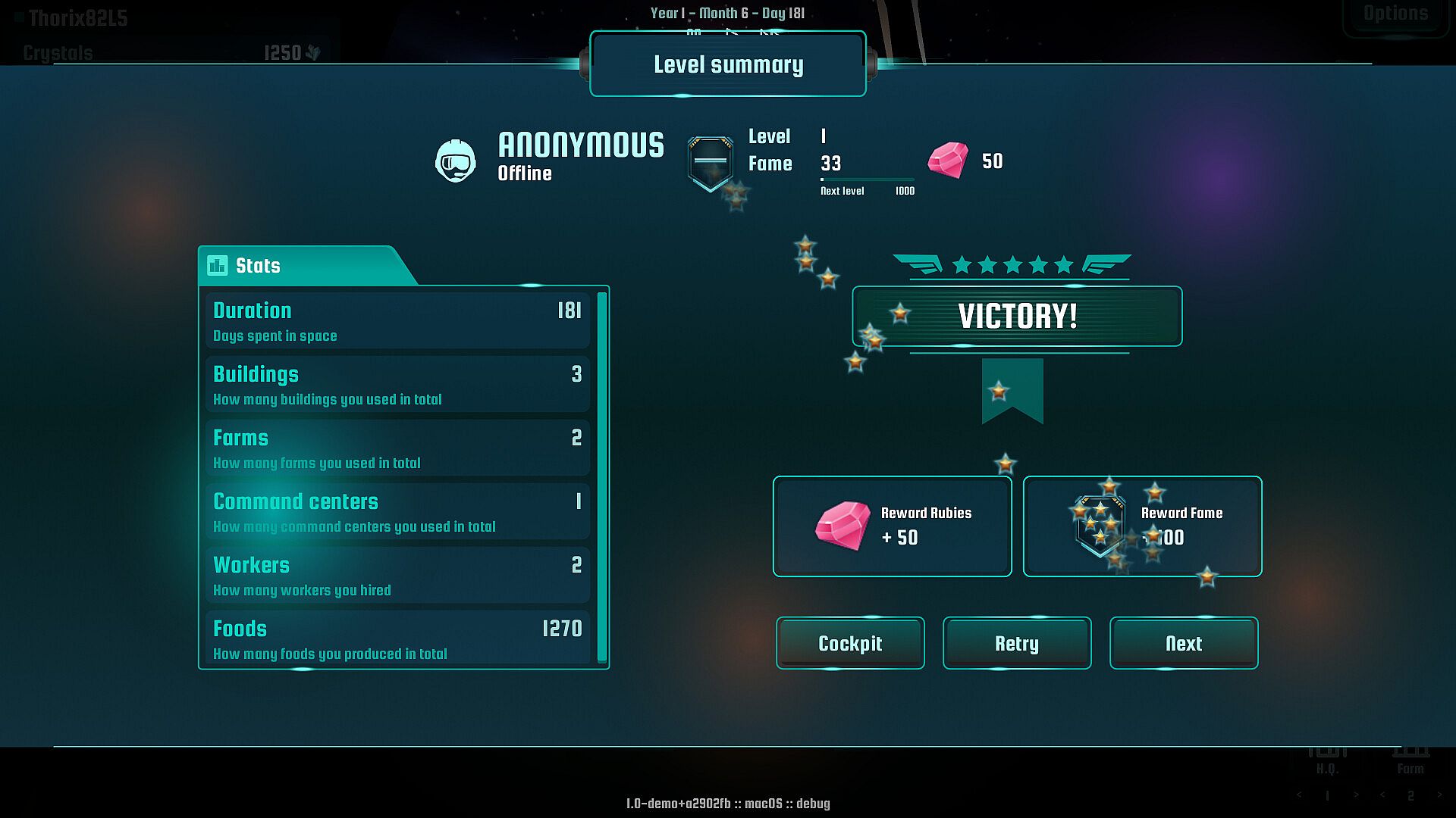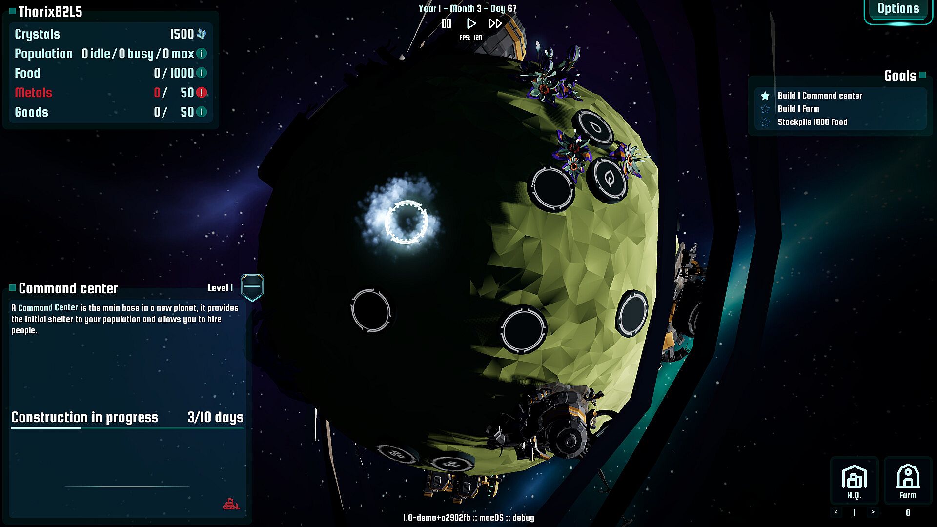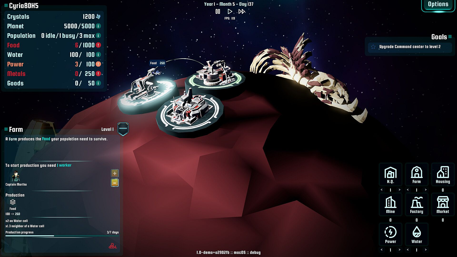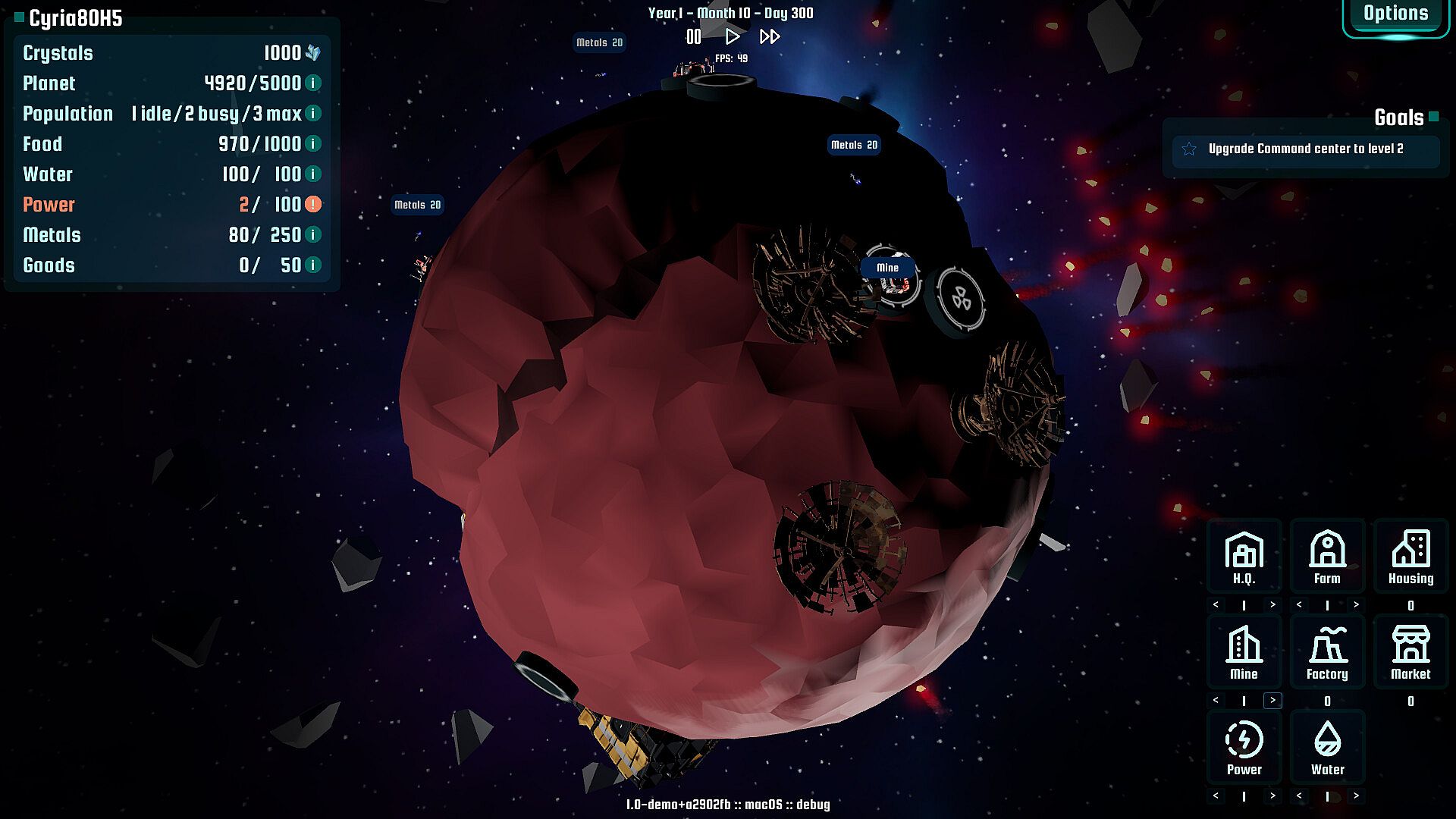 To become sustainable, exchanging goods with other planets is necessary. Extract metals by building mines, transform them into goods in your factories and sell those via your market. You will then obtain more money to develop.