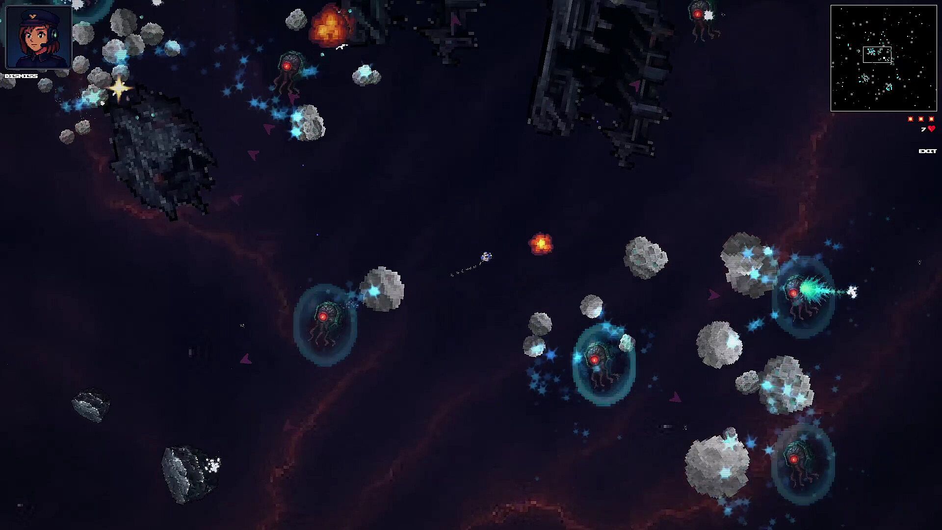 Procedurally generated sectors full of asteroids, enemies, and power-ups