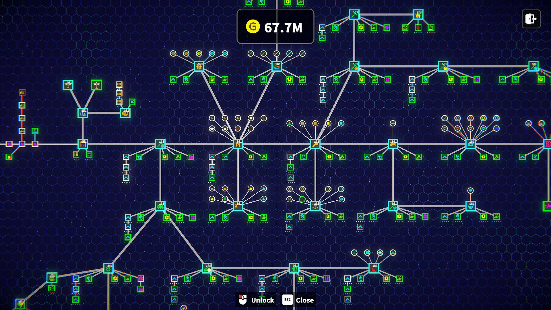 Invest your produced items and earnings to unlock nodes in the Tech Tree.