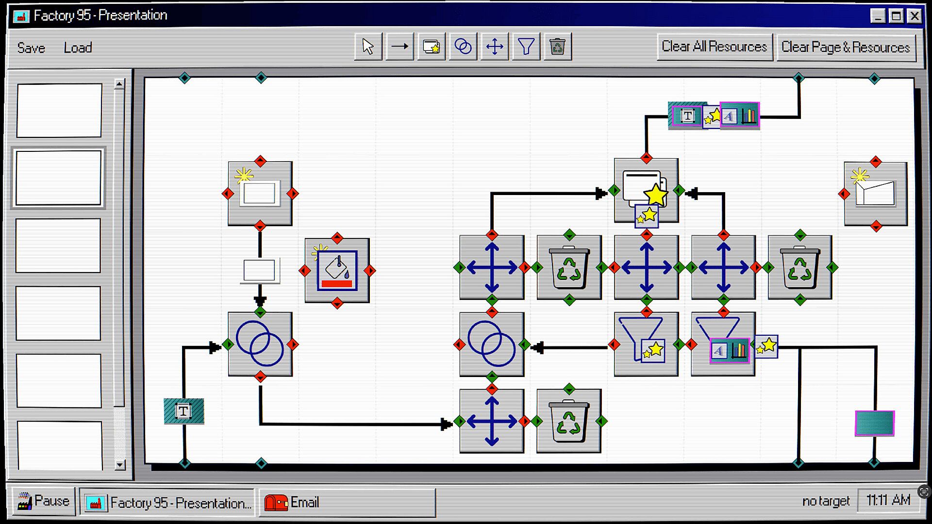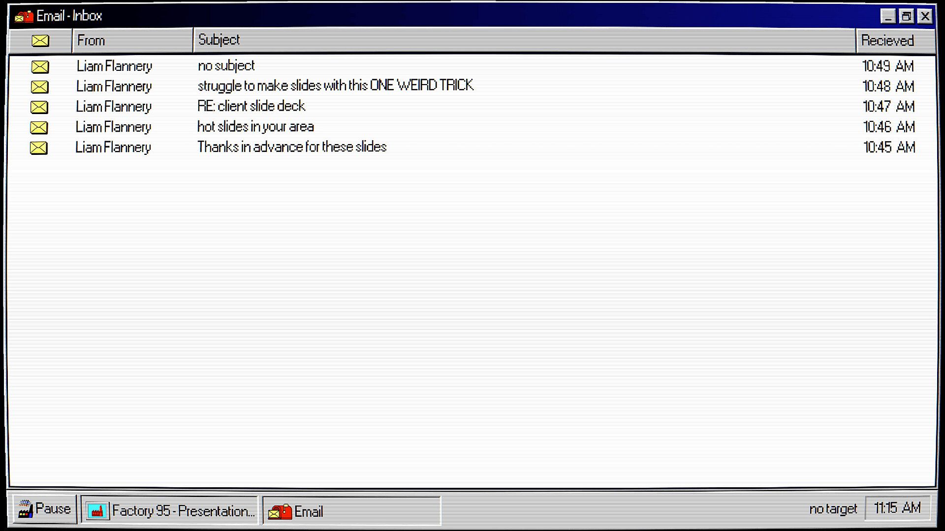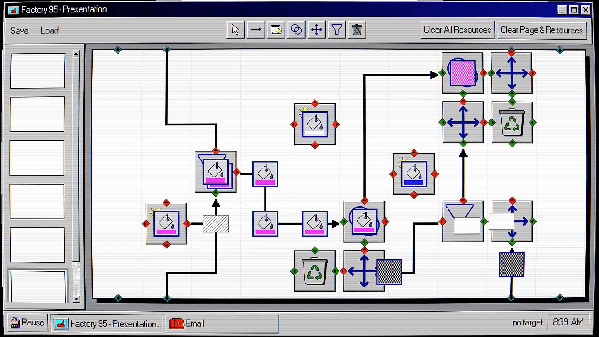 Factory 95 is a retro Windows inspired puzzle-automation game about making a slide show factory… in a slide show! Manage your space, make increasingly complex slides and worry about Y2K in this minimalistic factory builder.
