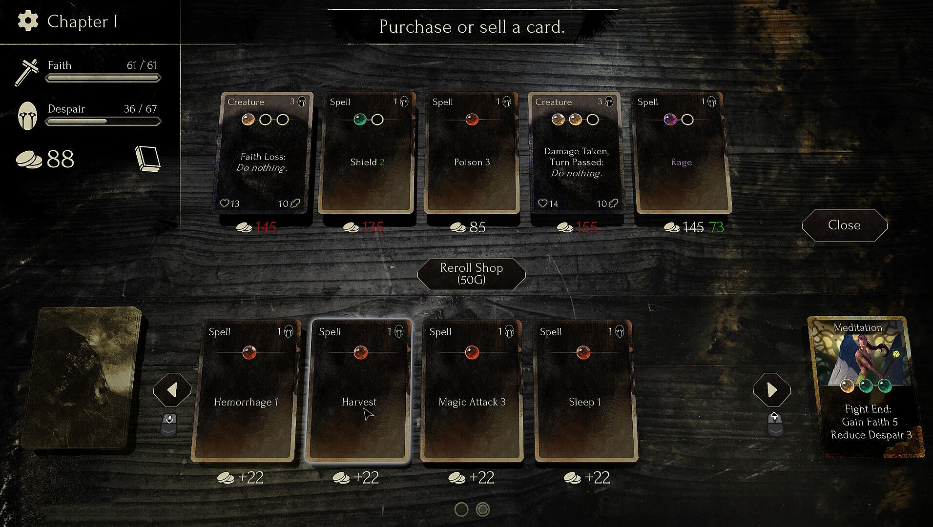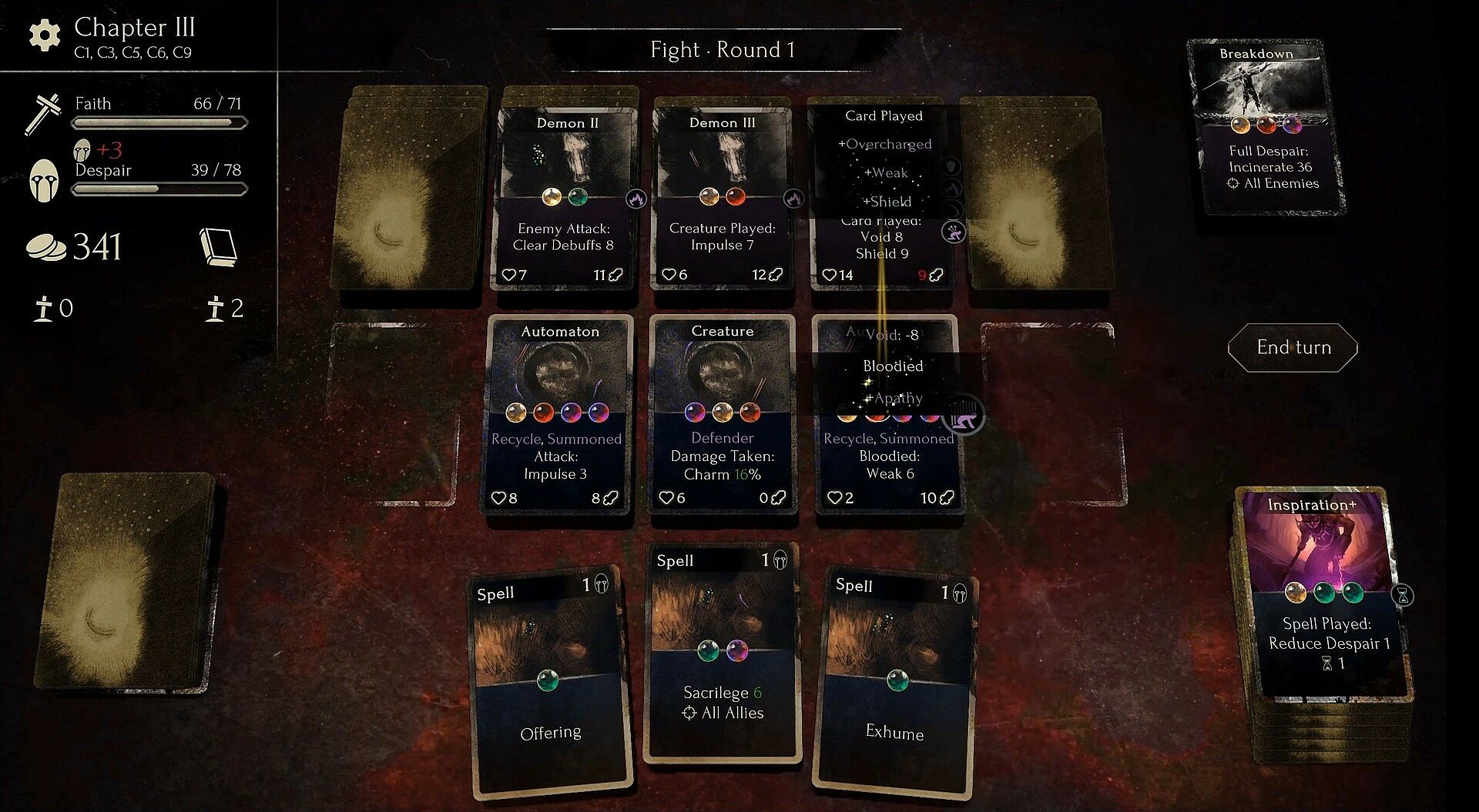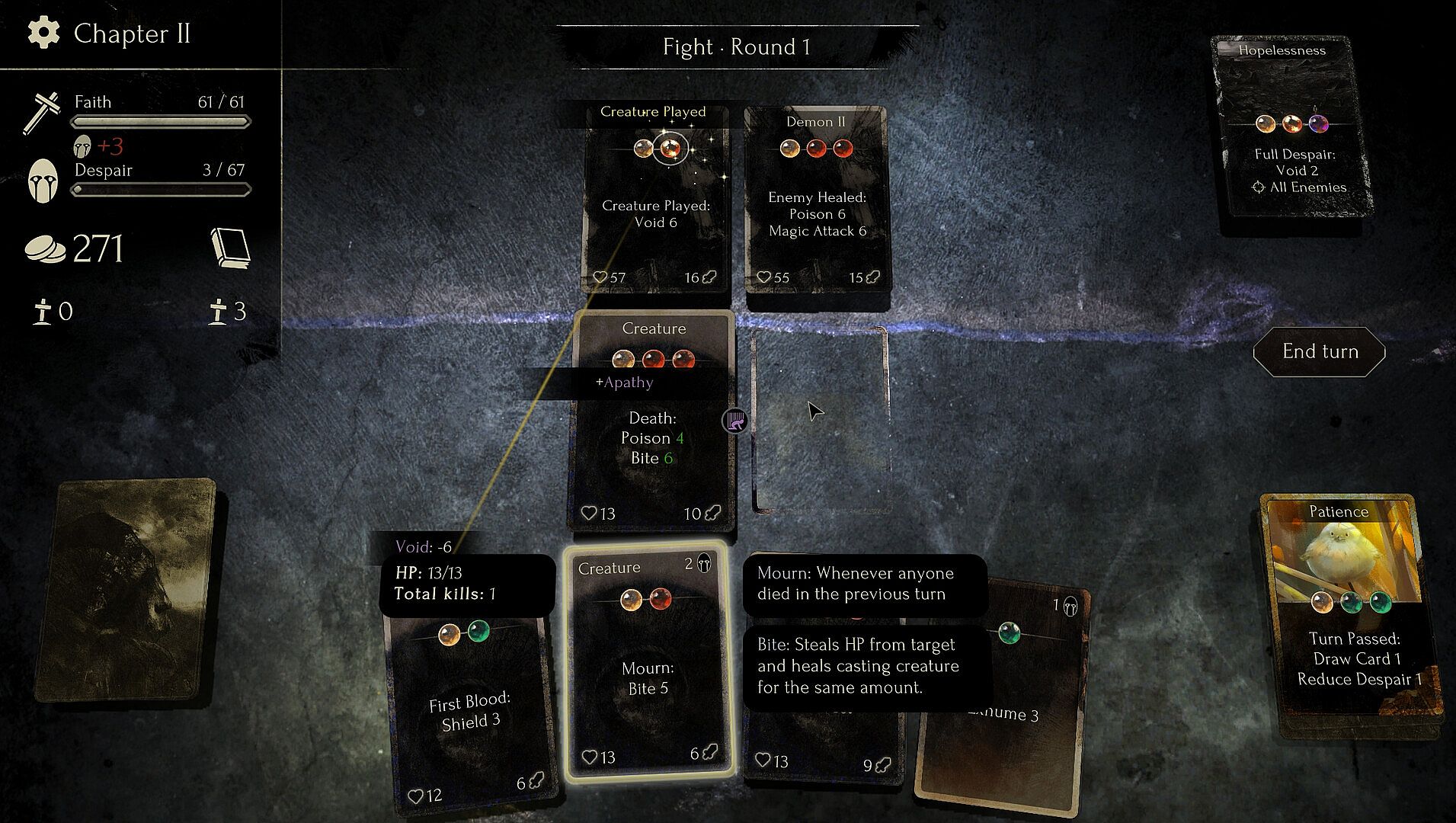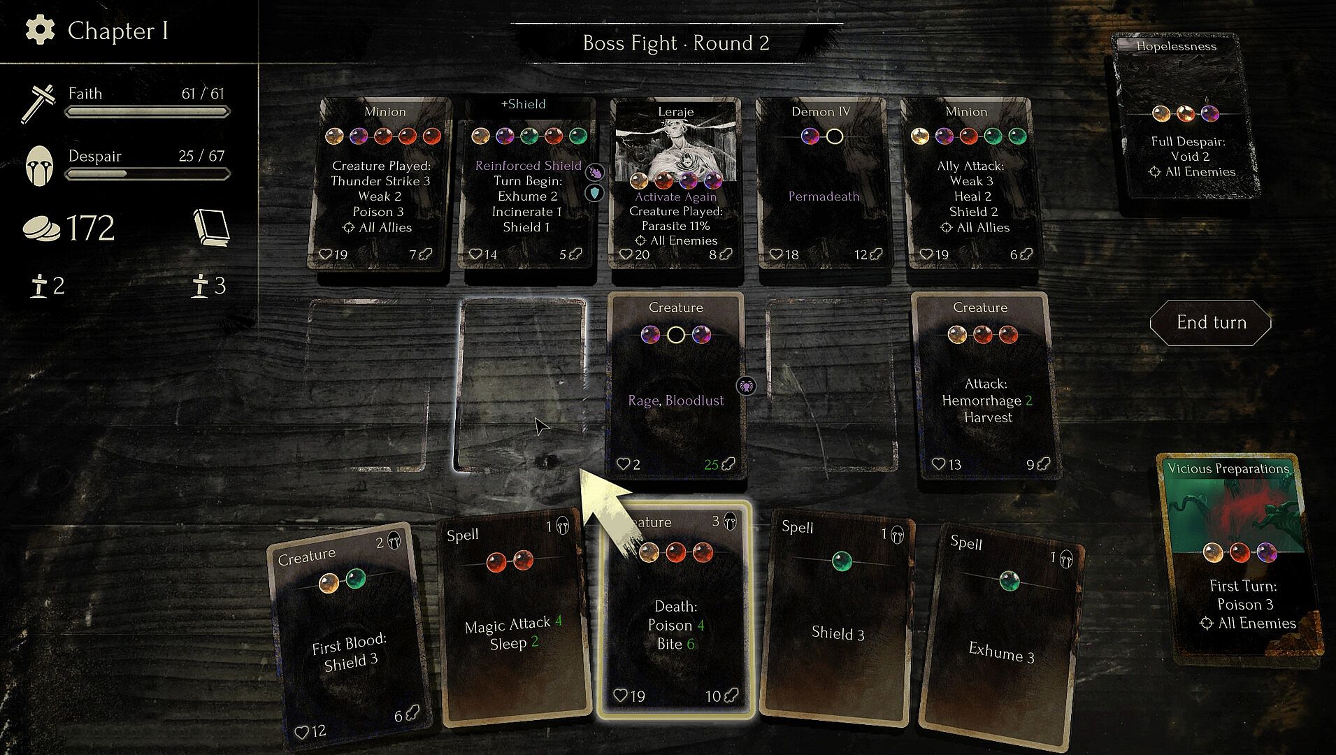 Faith in Despair is a grimdark roguelike deckbuilder that allows you to create your own cards using triggers, actions and modifiers to concoct devastating synergies. Every run holds new dangers and every action will inevitably push you closer towards despair.