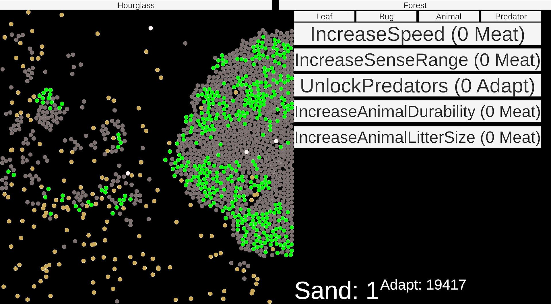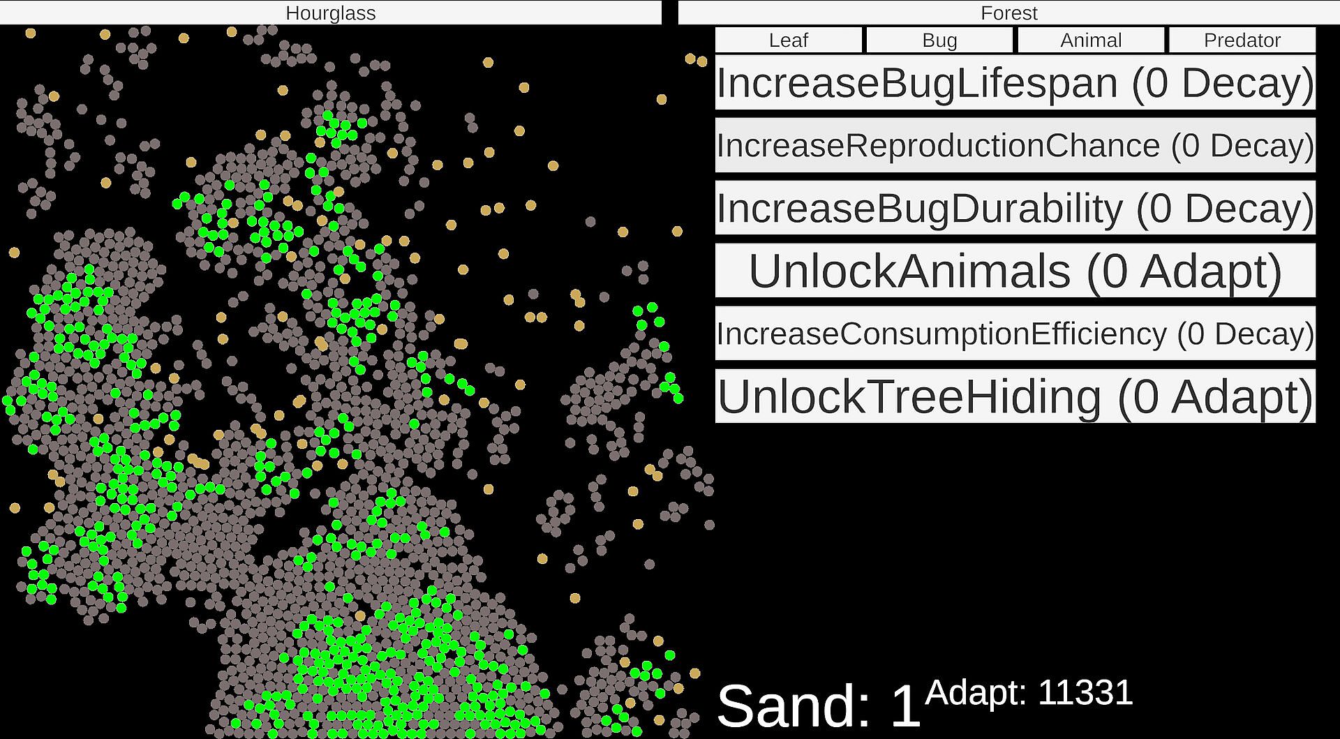 • Level 2: The next level is a forest.  You start out placing leaves, which costs nothing but a click.  You get a tiny adaptation of evolution for every particle you create, which lets you research upgrades.  Eventually, your leaf dies, leaving behind a dead leaf particle.  Once you teach the leaves to reproduce, you'll eventually have too many dead leaves to make new live ones.  Luckily, bugs love to eat dead leaves...