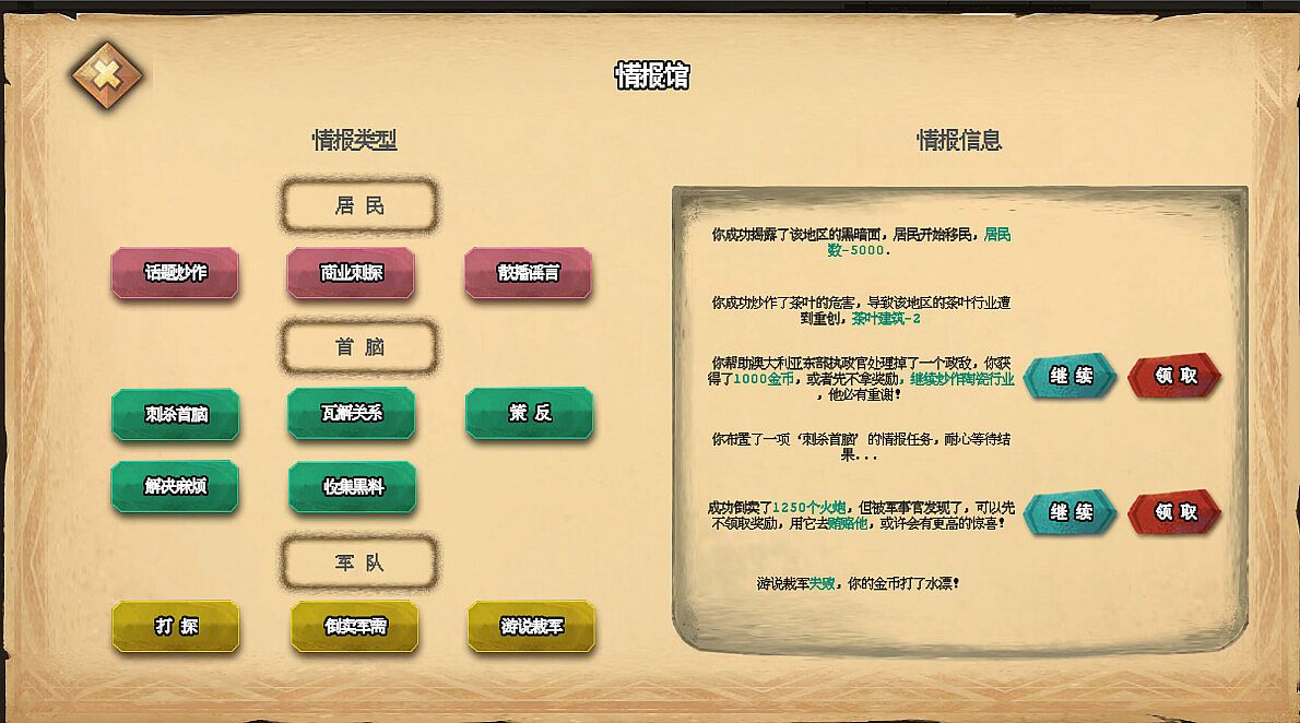 5. You can mobilize your clan's forces to carry out the following actions: clan alliances, clan revenge, clan wars, uncovering spies, sending spies, clan peace negotiations, bribing magistrates, coups, impeachment, assassination, campaign support, defection, land grabs, looting, price manipulation, arms smuggling, human trafficking, and import/export negotiations.